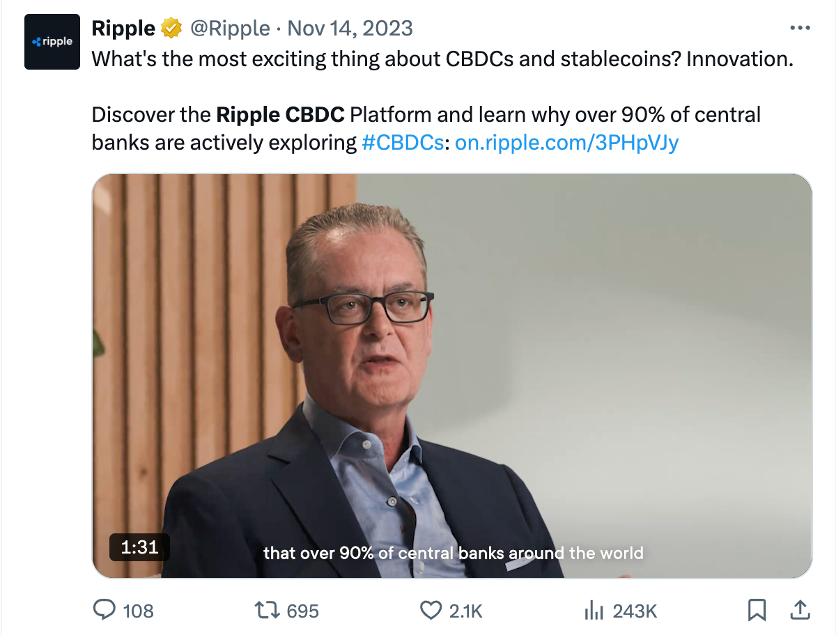리플은 지난 10년간 중앙은행 디지털화폐(CBDC) 발행을 적극 지지해왔습니다. 전 세계 중앙은행의 90% 이상이 CBDC를 검토하고 있으며, 리플은 자신들의 블록체인이 CBDC 발행과 유통에 가장 적합하다고 홍보해 왔습니다.