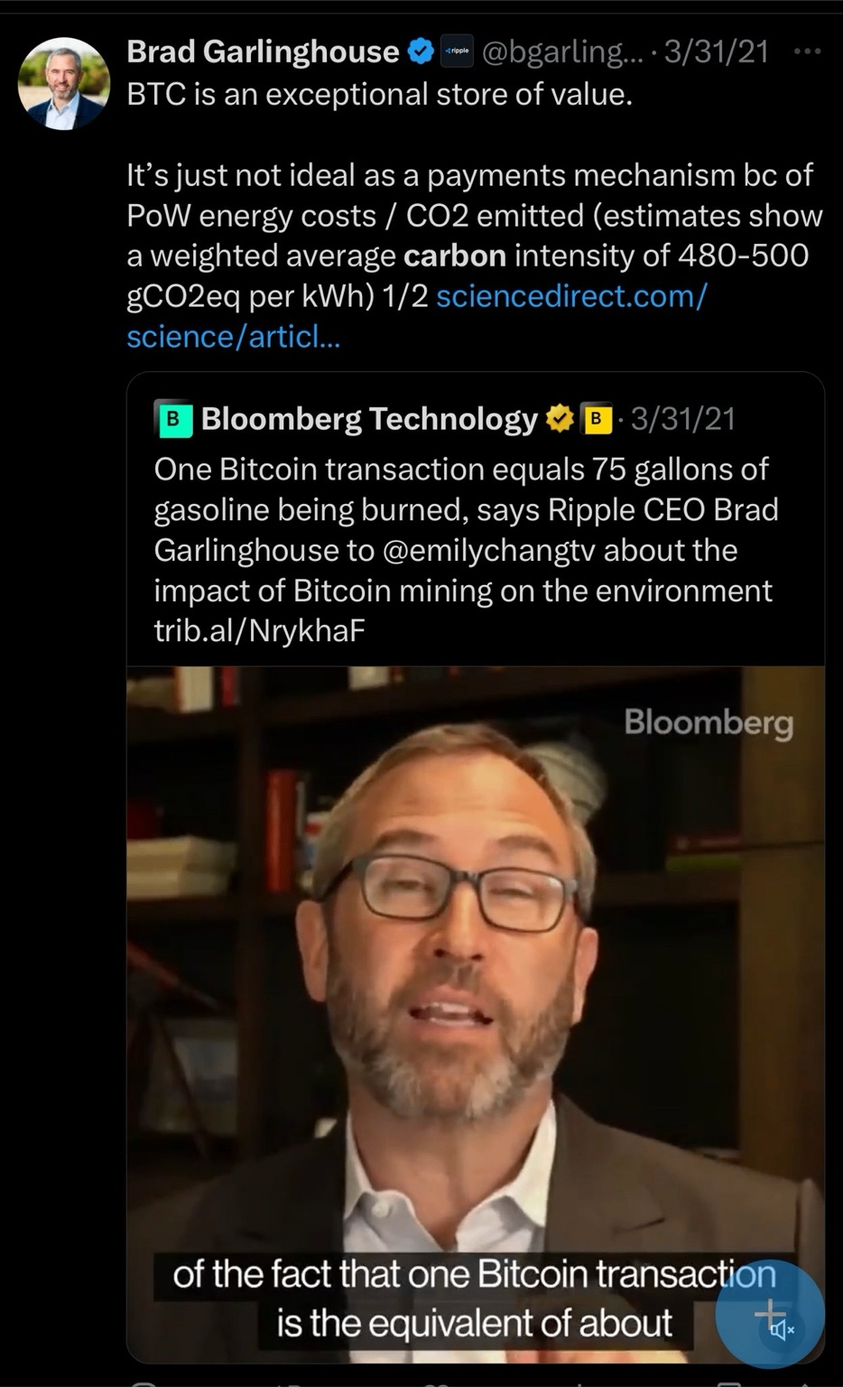리플과 경영진은 10년 넘게 비트코인의 작업증명(PoW) 시스템을 폄훼하는 데 앞장서 왔습니다. ESG 열풍을 무기로 비트코인이 지구 환경을 위협한다고 몰아세우며 자사 토큰 XRP를 친환경 대안으로 포장했습니다. 브래드 갈링하우스 CEO는 "비트코인 거래 한 번이 휘발유 75갤런을 태우는 것과 같다"는 등 왜곡된 주장을 반복했습니다. 비트코인 채굴이 친환경 전기발전 산업을 육성하고 버려지는 전기를 재활용하는 등 환경에 긍정적 영향을 미치는 점은 철저히 무시했습니다.