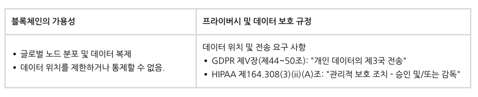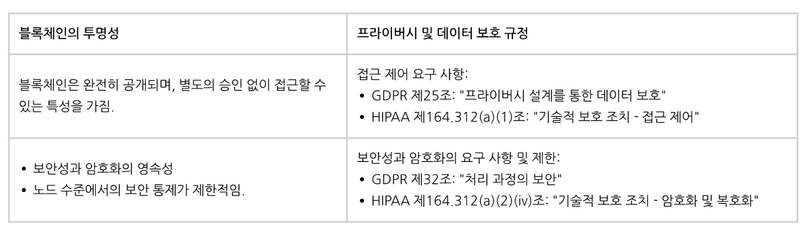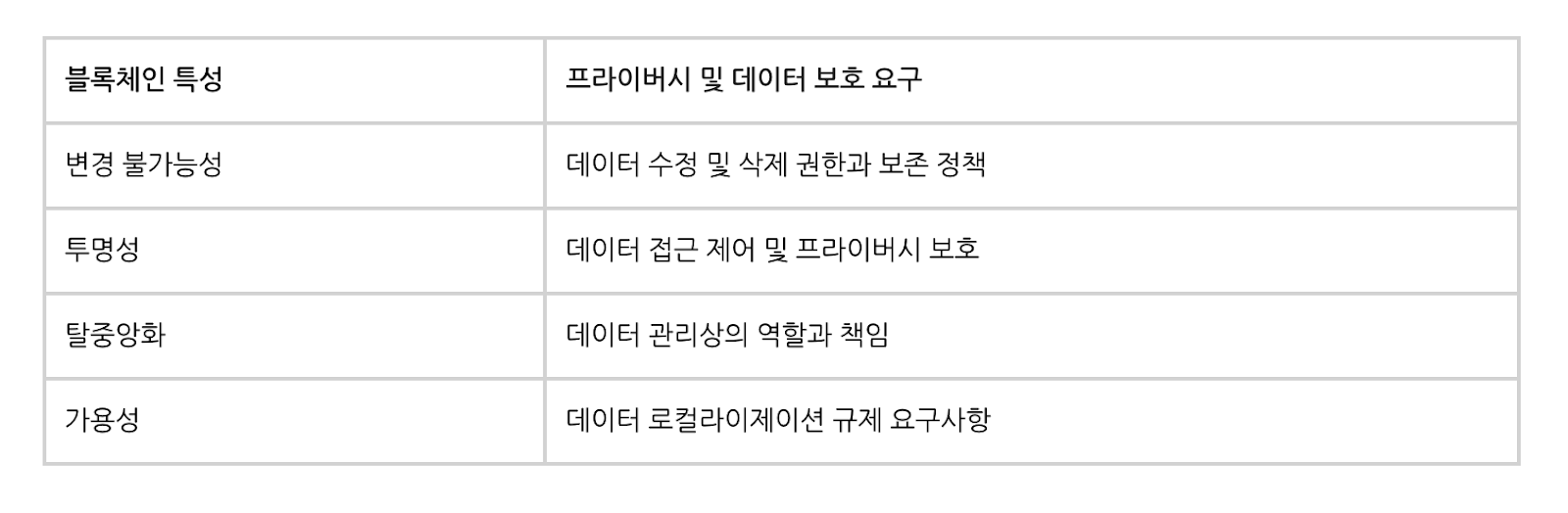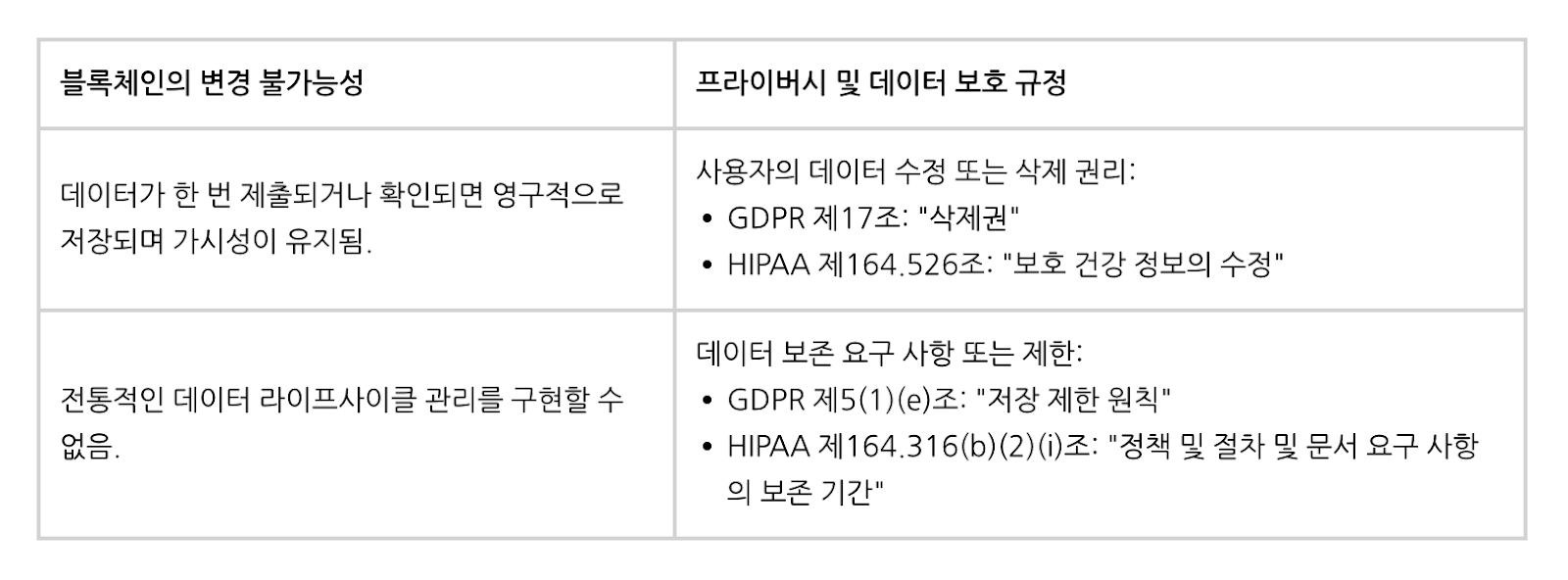 특히 블록체인의 핵심 특성은 데이터 보호와 프라이버시 요구를 충족하는 데 몇 가지 도전 과제를 제기합니다.