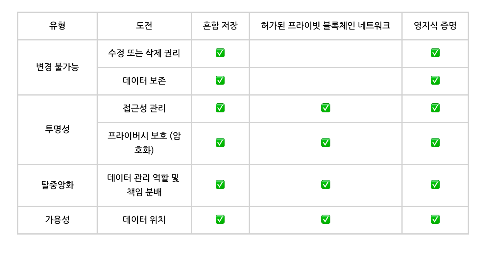 변경 불가능성: 데이터의 수정 및 삭제, 보존 정책은 오프체인에서 처리되며, 동시에 온체인에서 데이터 진위성을 검증할 수 있는 가능성을 유지합니다.