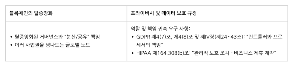 블록체인의 탈중앙화 특성, 특히 거버넌스 측면에서 규제 요구 사항의 역할 및 책임 규정과 충돌할 수 있습니다.