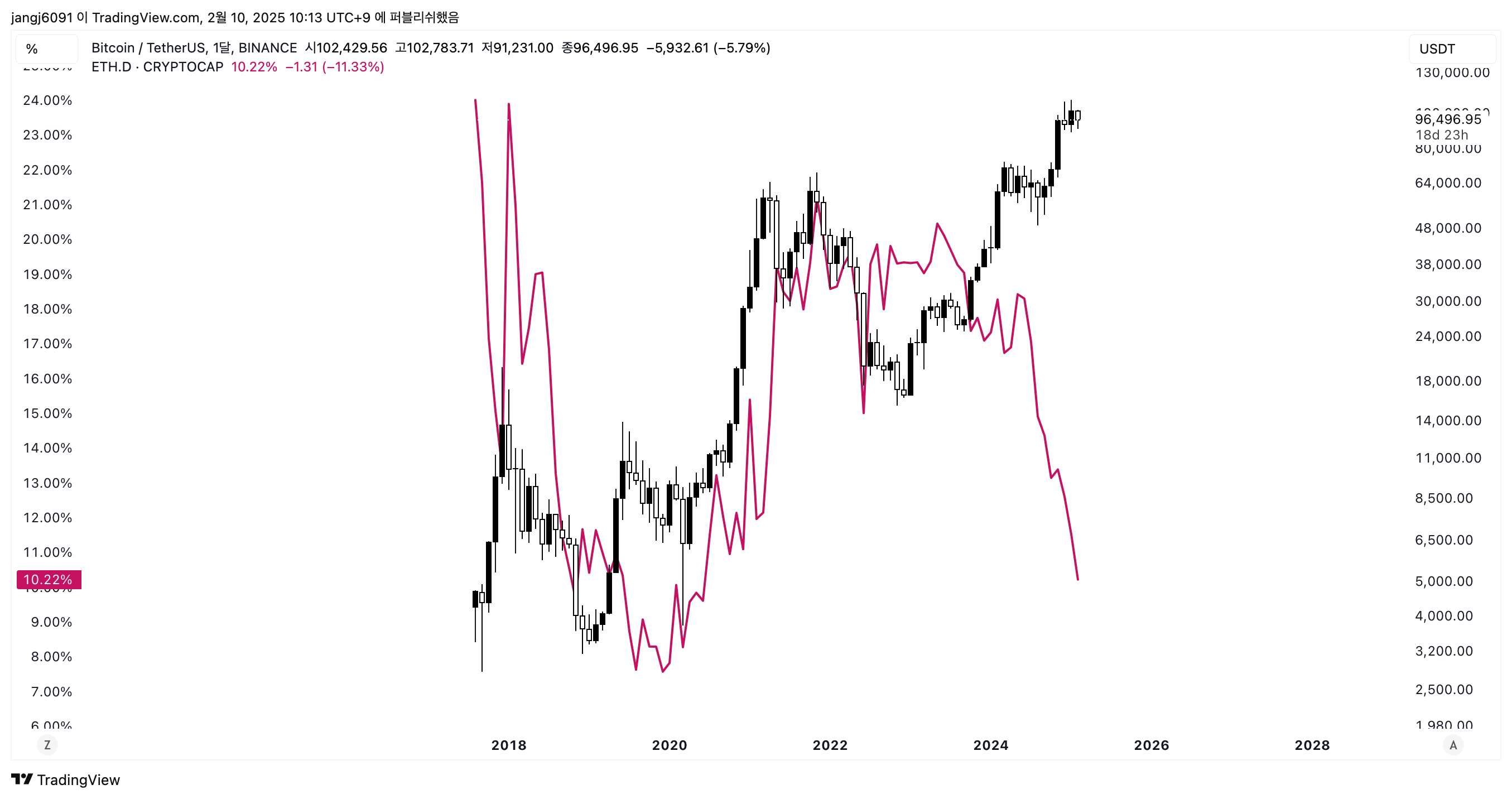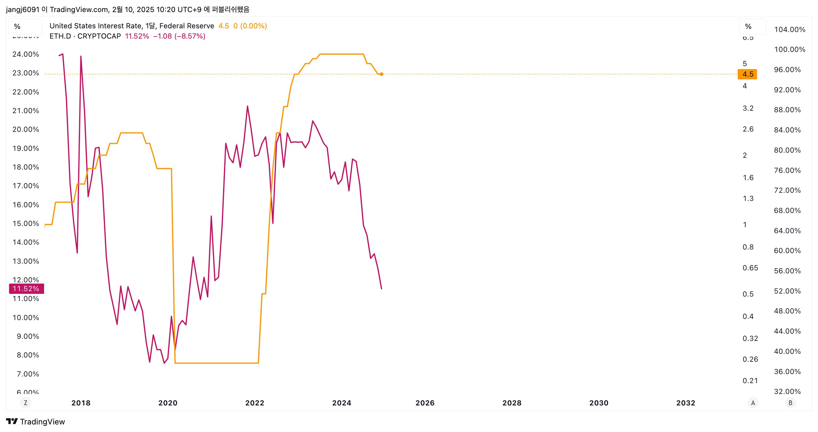 불장 신호의 핵심은 FED 연방준비은행이 충분히 금리 인하할 경우 이더리움 도미넌스가 올라갈 것인데 그때 비트코인 도미넌스가 격하게 떨어지는 현상이 발생하는 것입니다. 그때가 고점 시그널일 가능성이 있습니다.