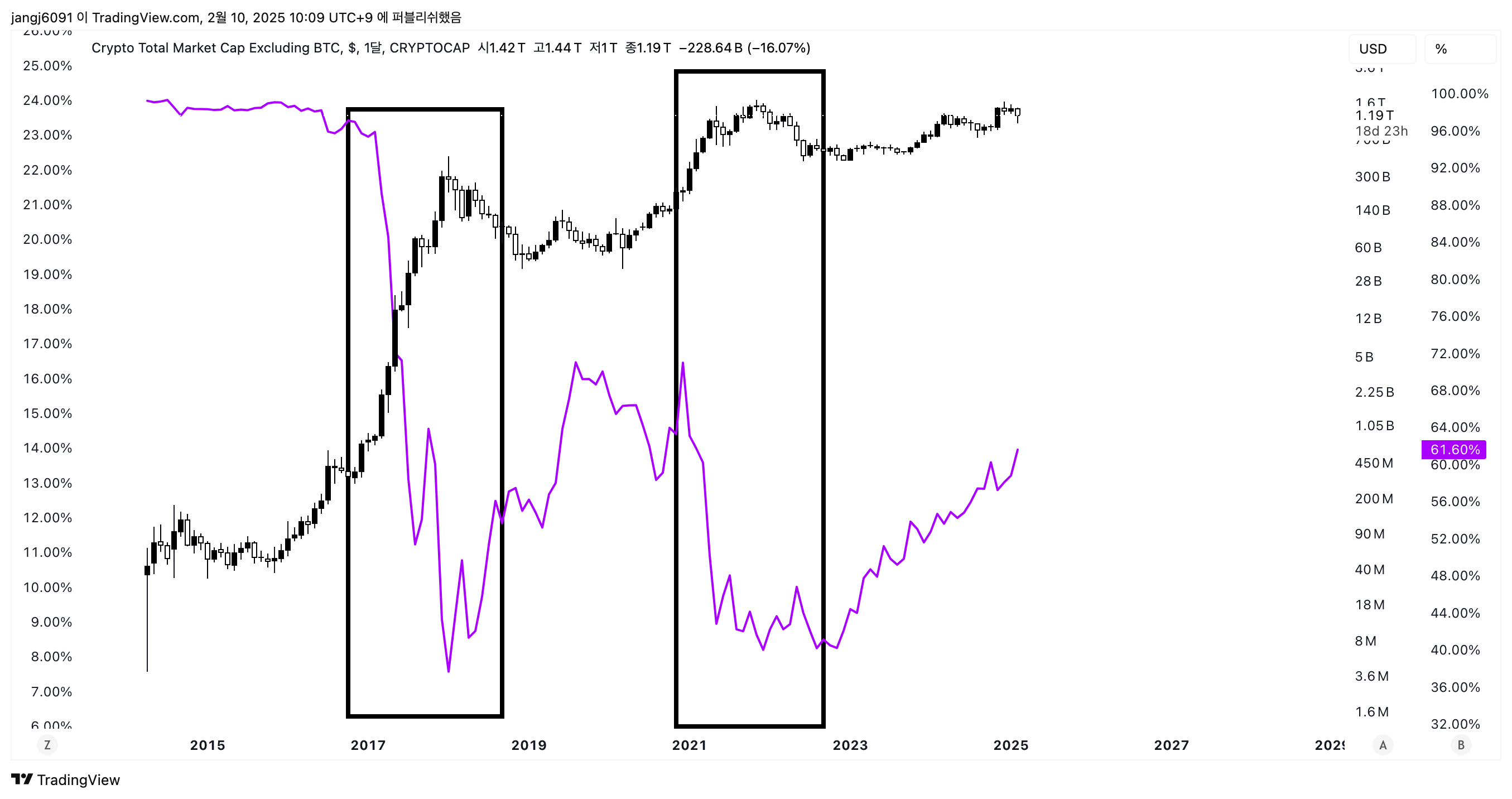 코인에서 가장 중요한 것은 트랜젝션이 많이 있느냐 없으냐와 커뮤니티입니다. 뭐 현재는 이더리움의 커뮤니티가 아직 비관적이지만 과거 사이클에도 비트코인 도미넌스가 높을 때 이더리움은 주춤했고 그 당시 때도 비트코인 도미넌스는 75프로까지도 갔습니다.