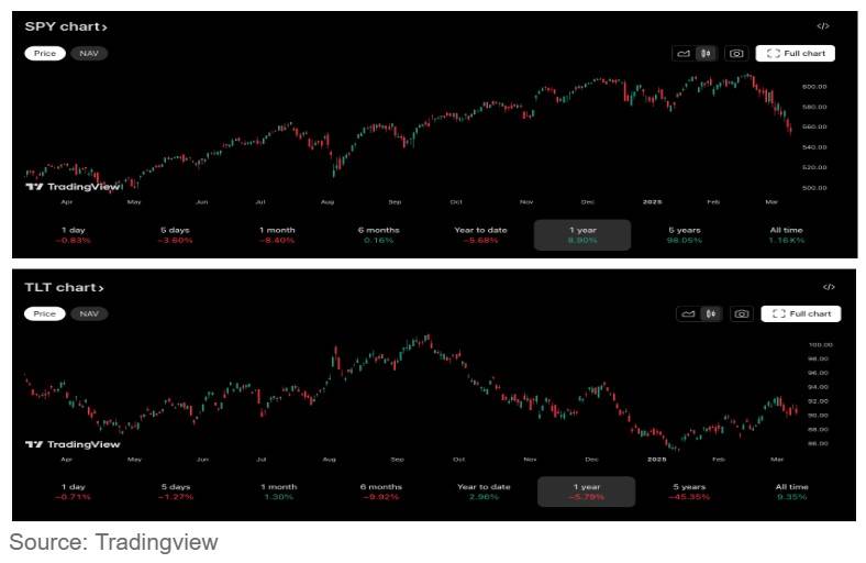 ETF TLT와 SPY의 움직임은 시장 상황을 명확히 보여준다.
