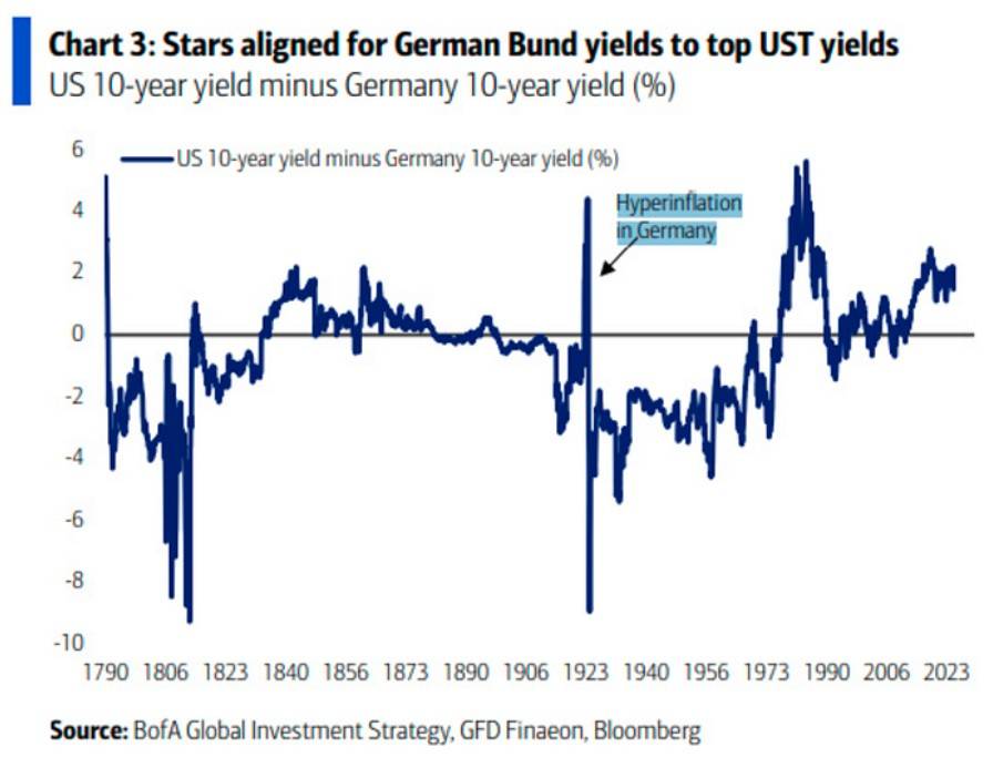 장기간 경기 침체에 빠져 있던 독일 경제에 군비 지출 증가는 경기 부양책으로 작용할 가능성이 있다. 국방 예산 확대로 인해 재정 정책이 완화되면 미국과 유럽 간 금리 차이가 축소될 수 있으며, 단기적으로 경제적 격차가 줄어들 가능성이 있다.