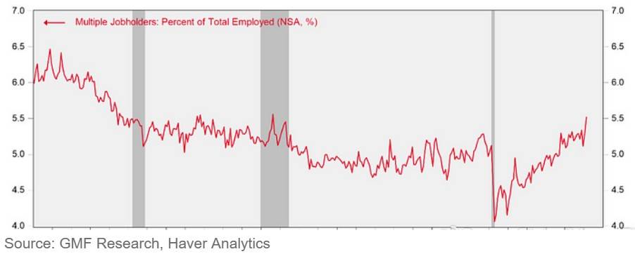 특히, 2월 다중 직업 보유자(Multiple-Job Holders) 및 자영업자의 증가가 가계 조사(Household Survey) 데이터를 왜곡했다. 다중 직업 보유자는 이번 달 15만 4천 명 증가하며, 고용 수치를 인위적으로 부풀렸다. 다중 직업 보유자의 비율은 전체 고용의 5.5%에 도달, 이는 글로벌 금융위기(GFC) 이후 최고 수준이다. 새롭게 추가된 다중 직업 보유자를 제외할 경우, 2월 순 고용 증가율은 사실상 ‘0’에 가까운 수준이다.
