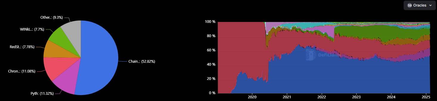 체인링크은 오라클 네트워크를 수년 간의 실전 운영하며 보안성과 신뢰성을 입증했다. 2019년 이후 체인링크의 시장 점유율은 빠르게 상승하기 시작했고, 2020년 중반 이후부터는 업계 1위 자리를 유지하고 있다. 2025년 2월 13일 기준으로 체인링크의 시장 점유율은 52.8%에 달한다.