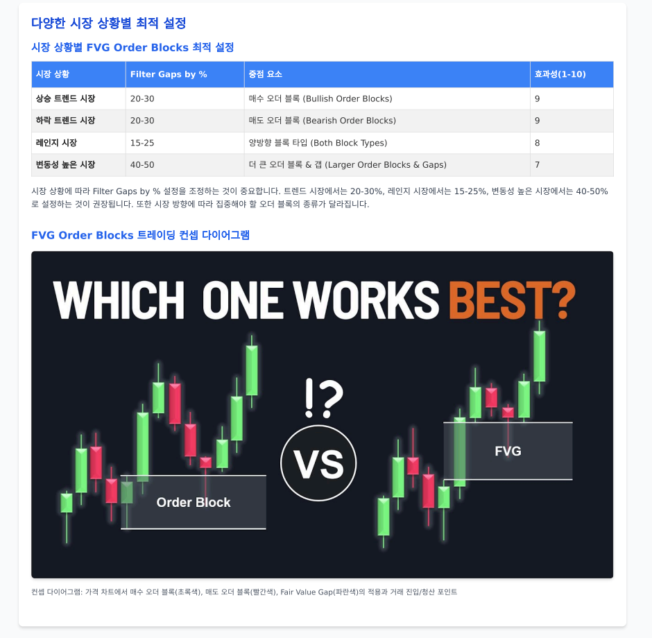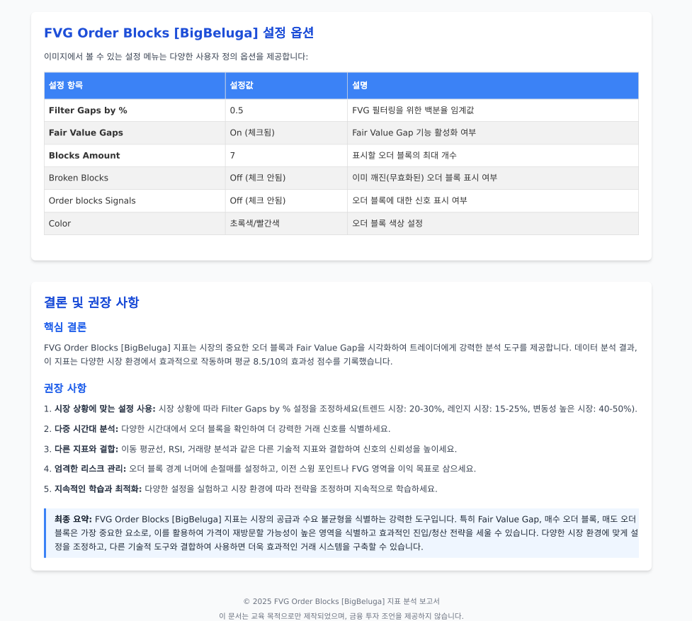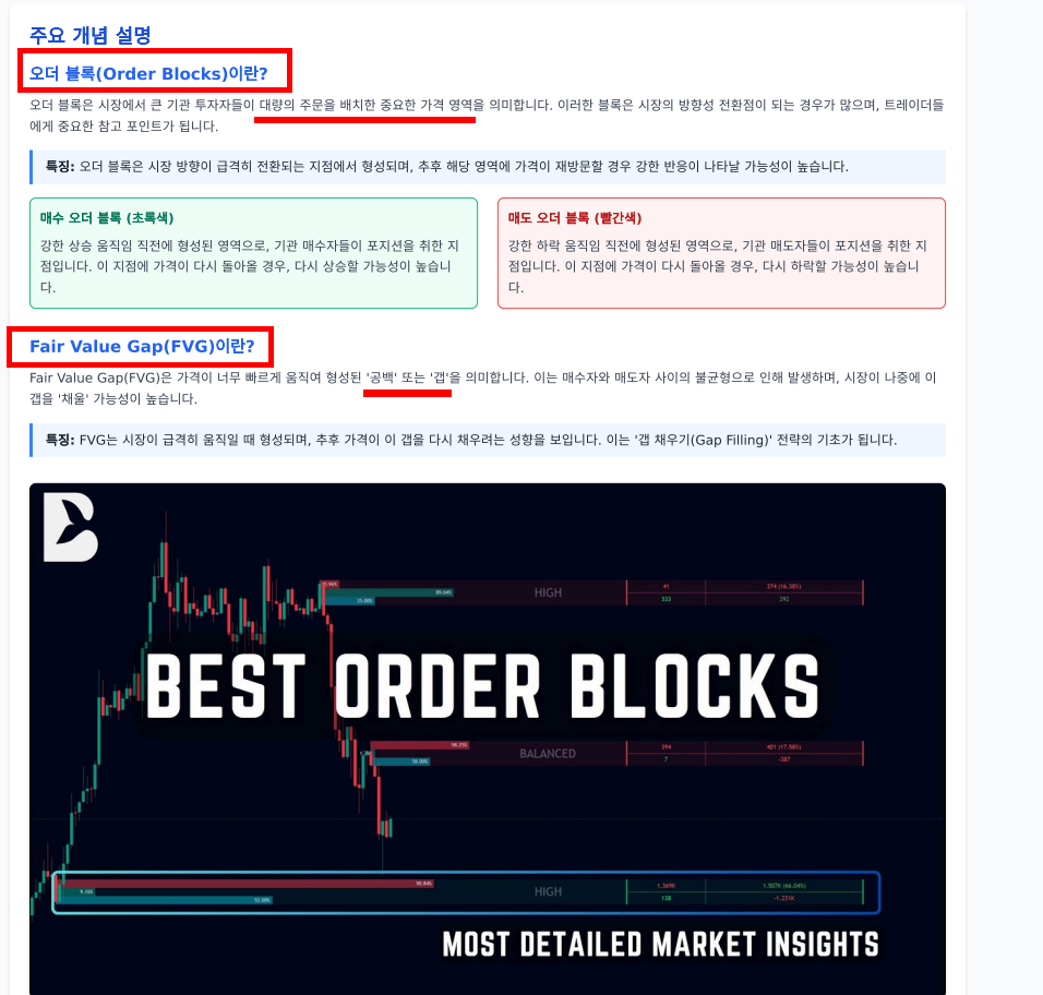 이 지표는 시장의 중요한 수요와 공급 영역을 시각화해주는 고급 분석 도구로, 가격이 빠르게 움직이며 생긴 불균형 구간(Fair Value Gap)과 주요 거래 구간(Order Blocks)을 쉽게 식별할 수 있게 해줍니다.