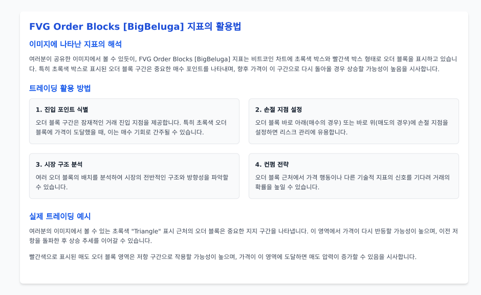 안녕하세요 오늘은 많은 트레이더들이 관심 가지고 있는 FVG Order Blocks [BigBeluga] 지표에 대해 소개해 드리려 합니다.
