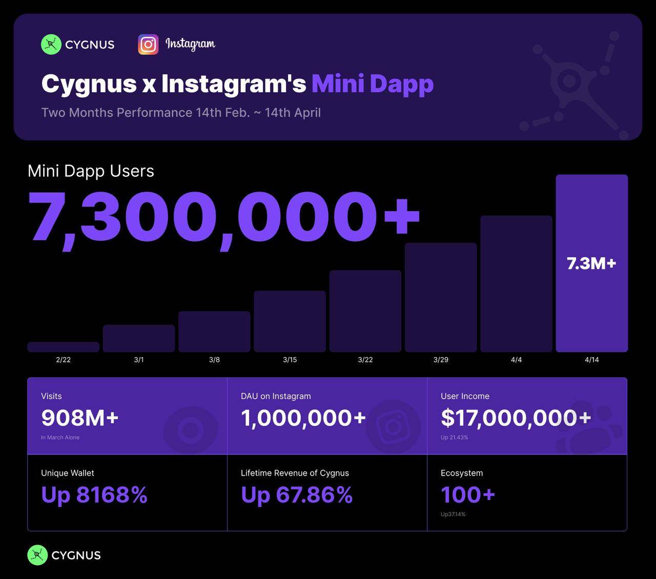 지난 2월 시그너스는 업계 최초 웹3 인스타그램 앱 레이어를 출시했고, 일일 활성 사용자(DAU)는 100만 명을 돌파하기도 했다. 시그너스의 사용자는 주로 인스타그램 보급률이 높은 북미, 유럽, 아시아태평양(APAC) 등 경제적으로 발전된 지역에서 유입되고 있다. 시그너스는 메타(구 페이스북, 인스타그램 운영사)로부터 공식 인증을 받은 기술 제공업체로, 계정 추상화(AA) 기술을 통해 인스타그램 계정과 웹3 월렛의 연동을 지원한다. 이를 통해 사용자는 시드 문구 등 복잡한 웹3 월렛 사용 조건을 배제하더라도 보다 쉽게 웹3 참여자가 될 수 있다는 설명이다.
