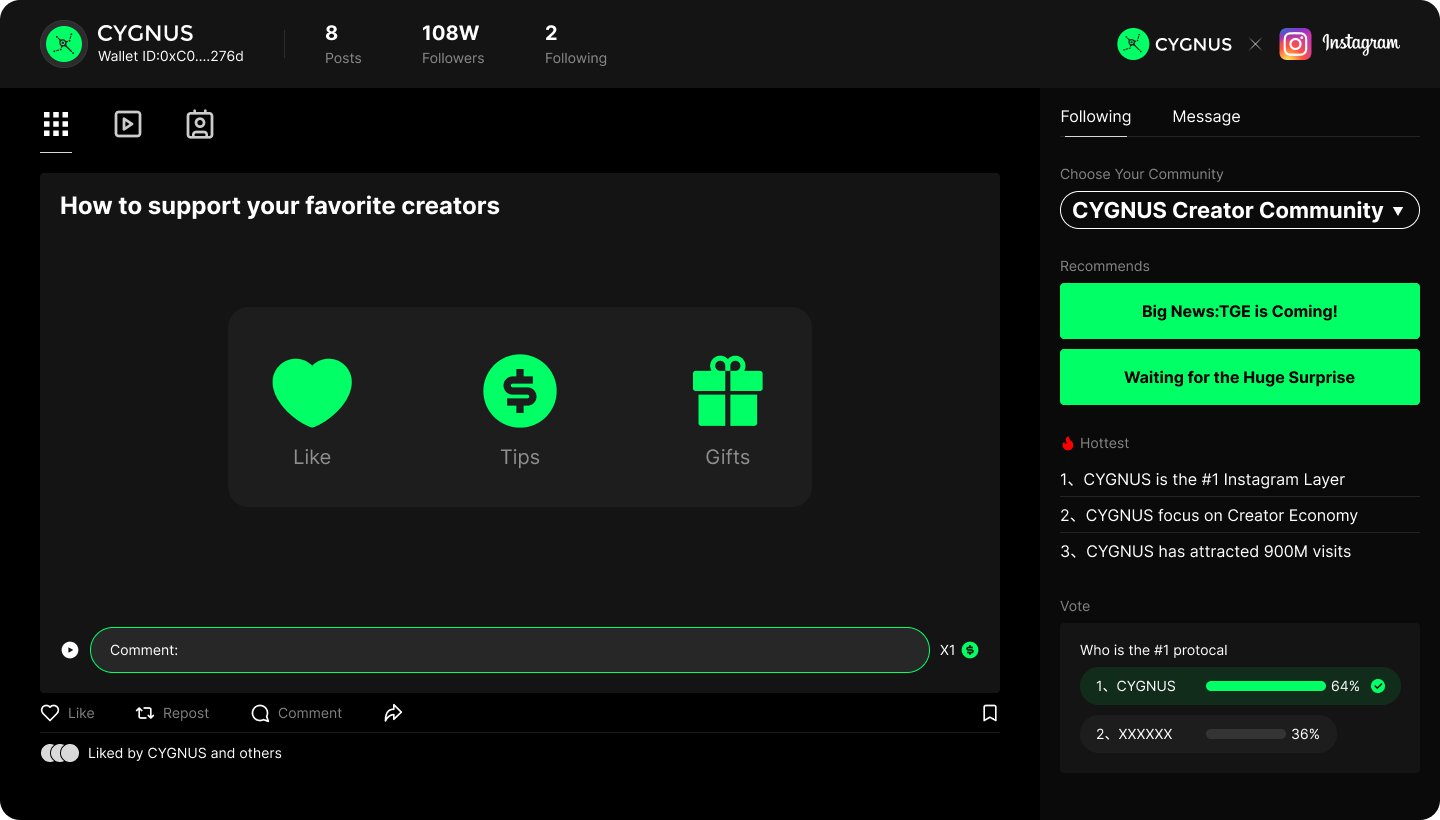 결론적으로 시그너스와 인스타그램의 파트너십은 단순히 이목을 끌기 위한 보여주기식 트렌드가 아니라 웹3 소셜 모델을 재정의하는 데 목적을 두고 있다. 곧 출시될 CYGNUS 토큰을 통해 시그너스는 사용자, 크리에이터, 브랜드, 기업에 더 많은 기회를 제공하고, 새로운 참여와 수익화 수단을 도입할 예정이다. 이를 통해 전 세계적인 웹3 보급화와 채택률 증가에 기여하고 지속 가능한 가치 중심의 차세대 소셜 네트워크 시대를 열어갈 전망이다.