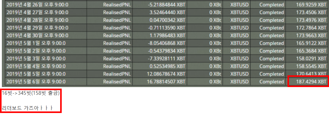 결국 2018년부터 선물 거래 시작 → 2019년 5월 세상에 처음으로 수익을 공개했는데요. 결과는? 비트코인 16개가 반년만에 354개로 늘어나는 워뇨띠 매직.