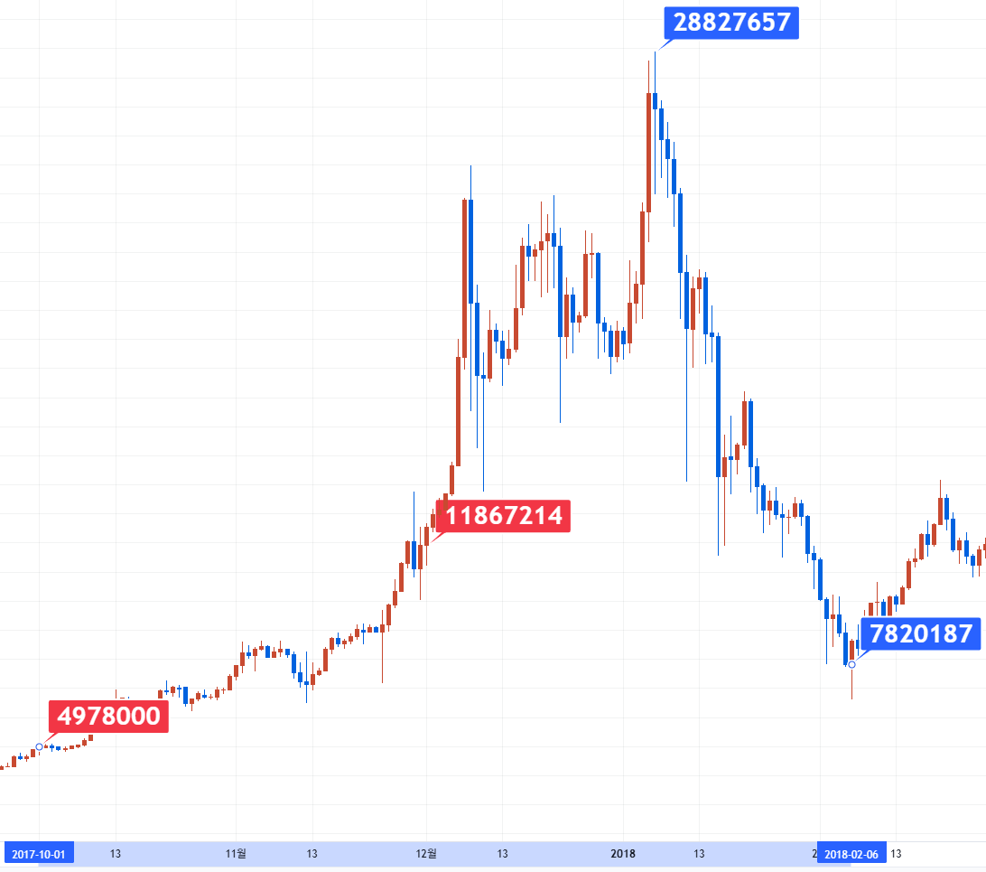 당시 대 상승장이었는데요. 2012년 10월 400만원 쯤이던 비트코인이 12월 1,000만원 넘어서 2018년 1월 2,800만원까지 올랐어요.