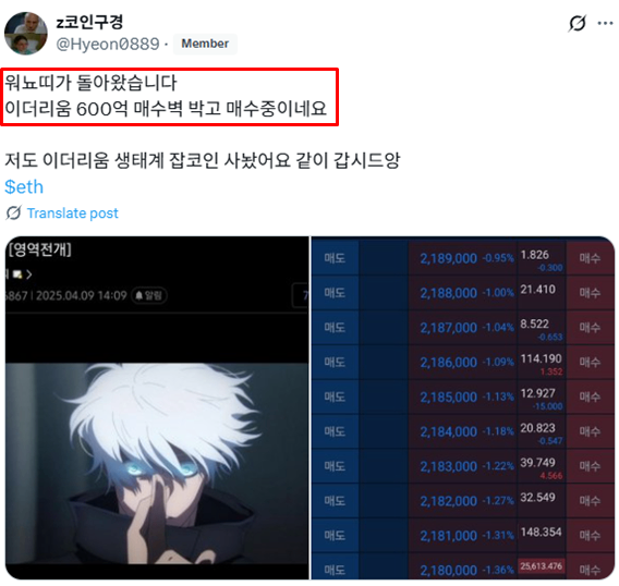 비트코인과 이더리움에 각각 600억의 매수를 걸어두며 1차 인증, 2차 인증 컴백.