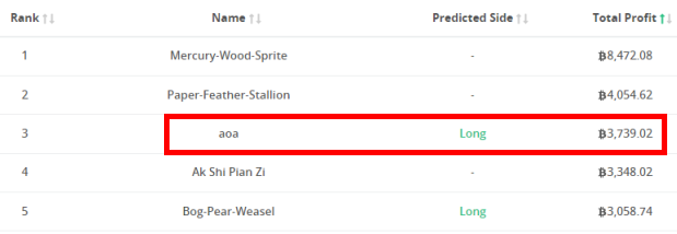 워뇨띠는 더 이상 수익에 대한 글을 올리지 않았지만 그의 투자 내역은 계속 공유되었는데요. 거래소 리더보드(leader board | 누적 수익 랭키을 보는 곳)에 워뇨띠 닉네임 ‘AOA’의 수익 내역이 실시간으로 공개 됐기 때문.