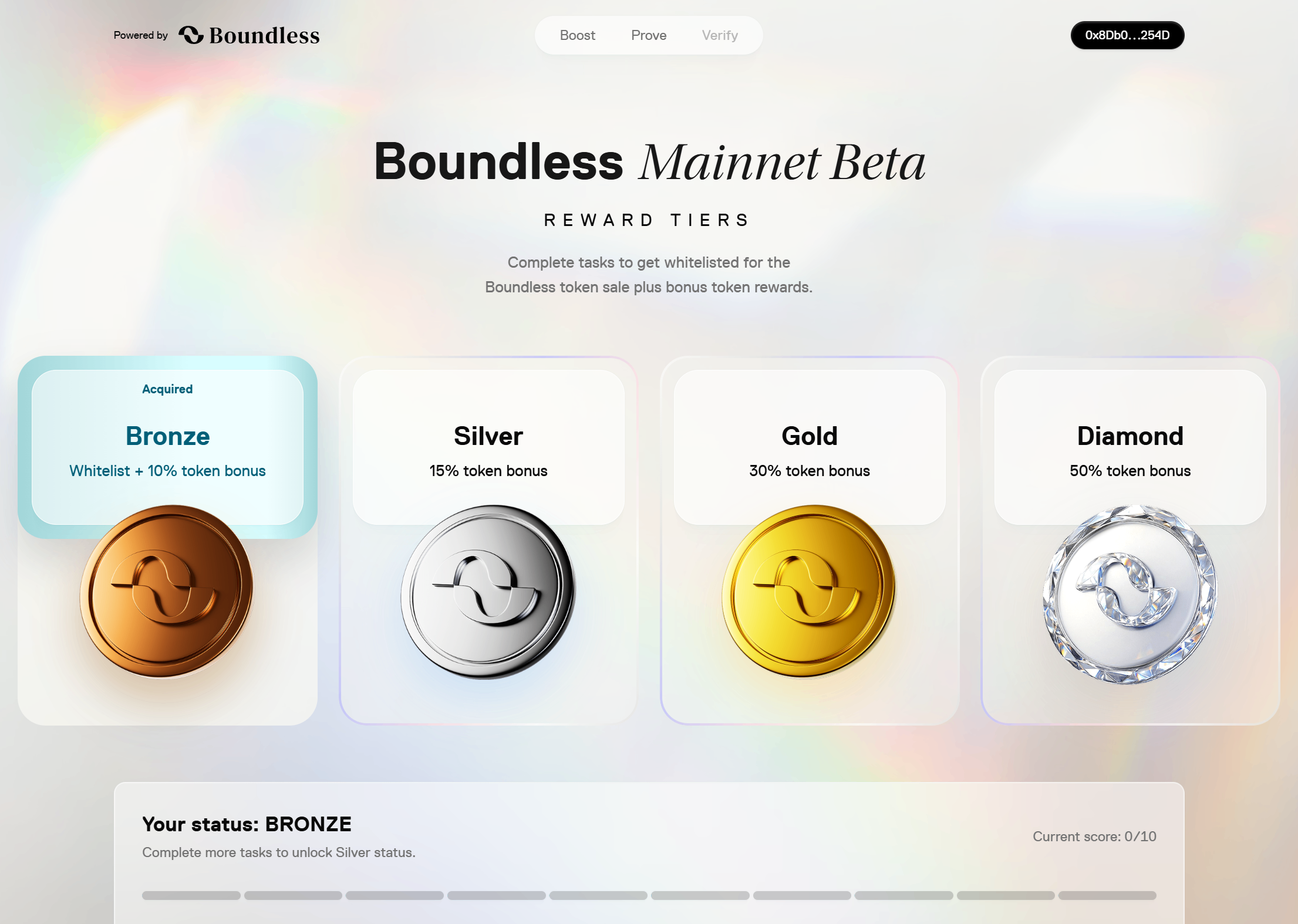- Boundless는 자체 토큰 세일까지 예정되어 있는데 메인넷 베타와 함께 오픈한 데스크 미션을 진행 시 브론즈, 실버, 골드, 다이아몬드 등급을 얻고 토큰 세일에 대한 추가적인 보상까지 획득 가능