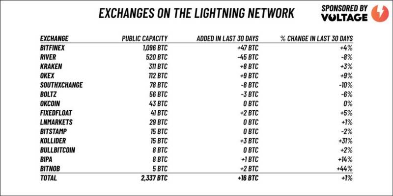 지난 2022년 11월 기준 비트코인 거래소들의 라이트닝 네트워크 public capacity는 약 2,337 BTC로 4월 대비 32%가 증가하였으며 이는 LN의 전체 용량의 약 46%에 해당하는 수치입니다.