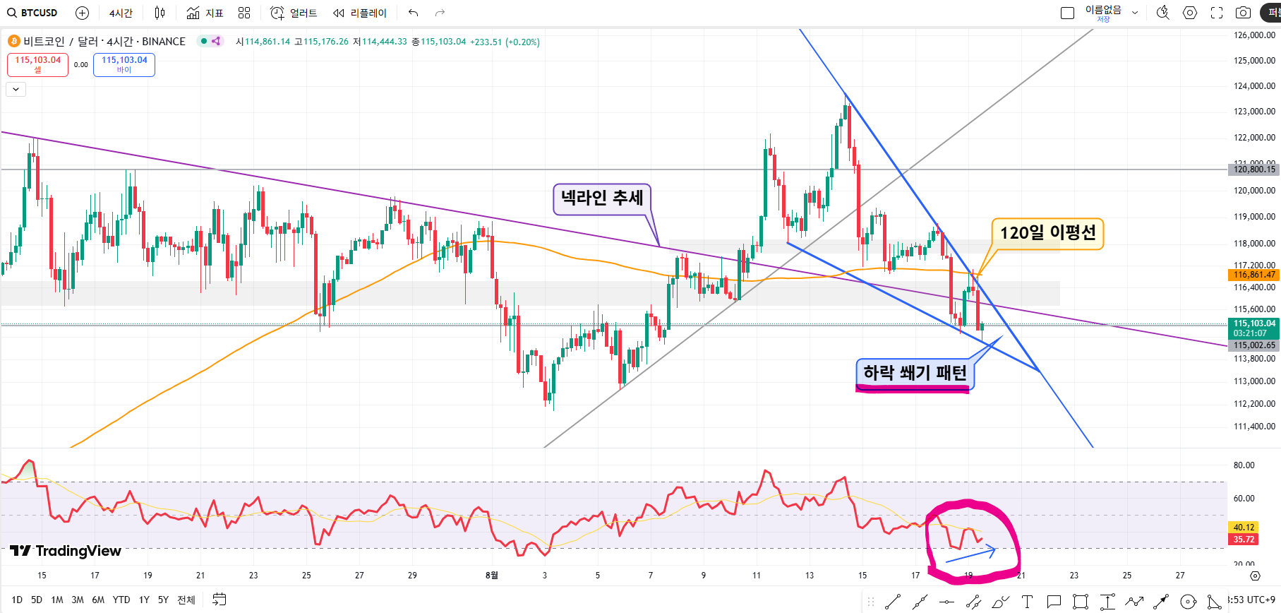 - 114~115K + 쐐기 하단 이탈 시 → 112~113K 열림, 하락 추세 가속화