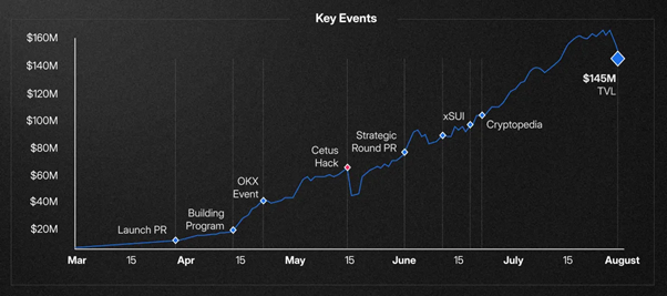 모멘텀은 이제 출시된지 4개월이 막 지났지만, 최고 TVL은 1.8억 달러를 상회했다. 누적 거래량은 21일 기준 88억 달러에 달하고 있어, 수이 생태계 내 가장 풍부한 유동성을 자랑하는 DEX로 우뚝 섰다.