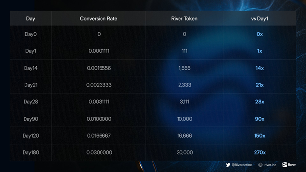 핵심은 전환 비율이 고정된 것이 아니라 시간이 지날수록 높아진다는 점이다. 즉, 더 오래 기다릴수록 보유한 리버 포인트로 더 많은 RIVER 토큰을 받을 수 있다.