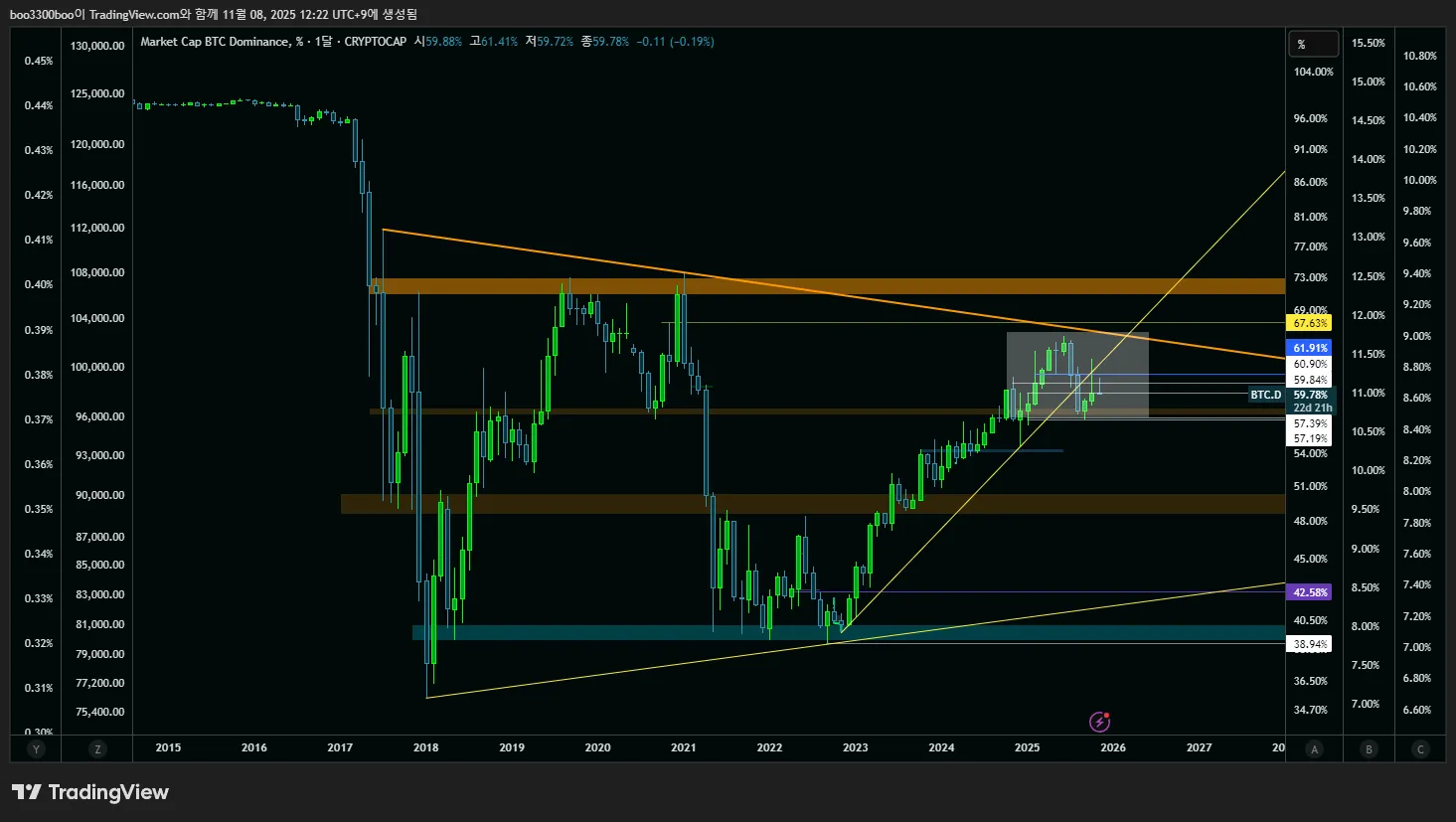 이는 알트장세 가능성을 의미하며, 추후 하락장 가능성도 의미합니다.