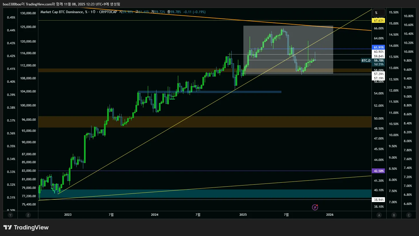 이마저도 깨질경우 곧 본격적으로 도미넌스가 하락하며 알트불장이 올 것이며,