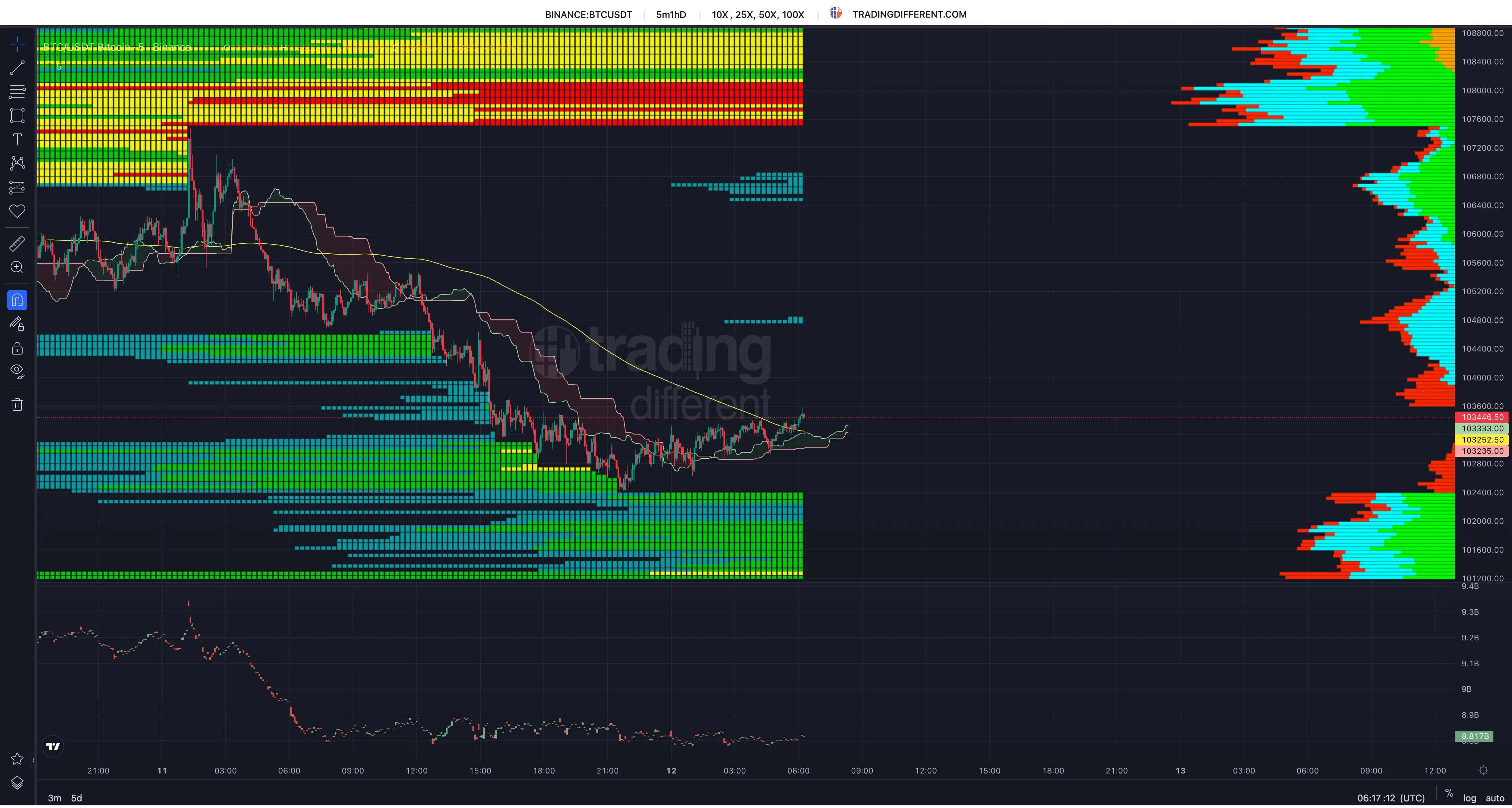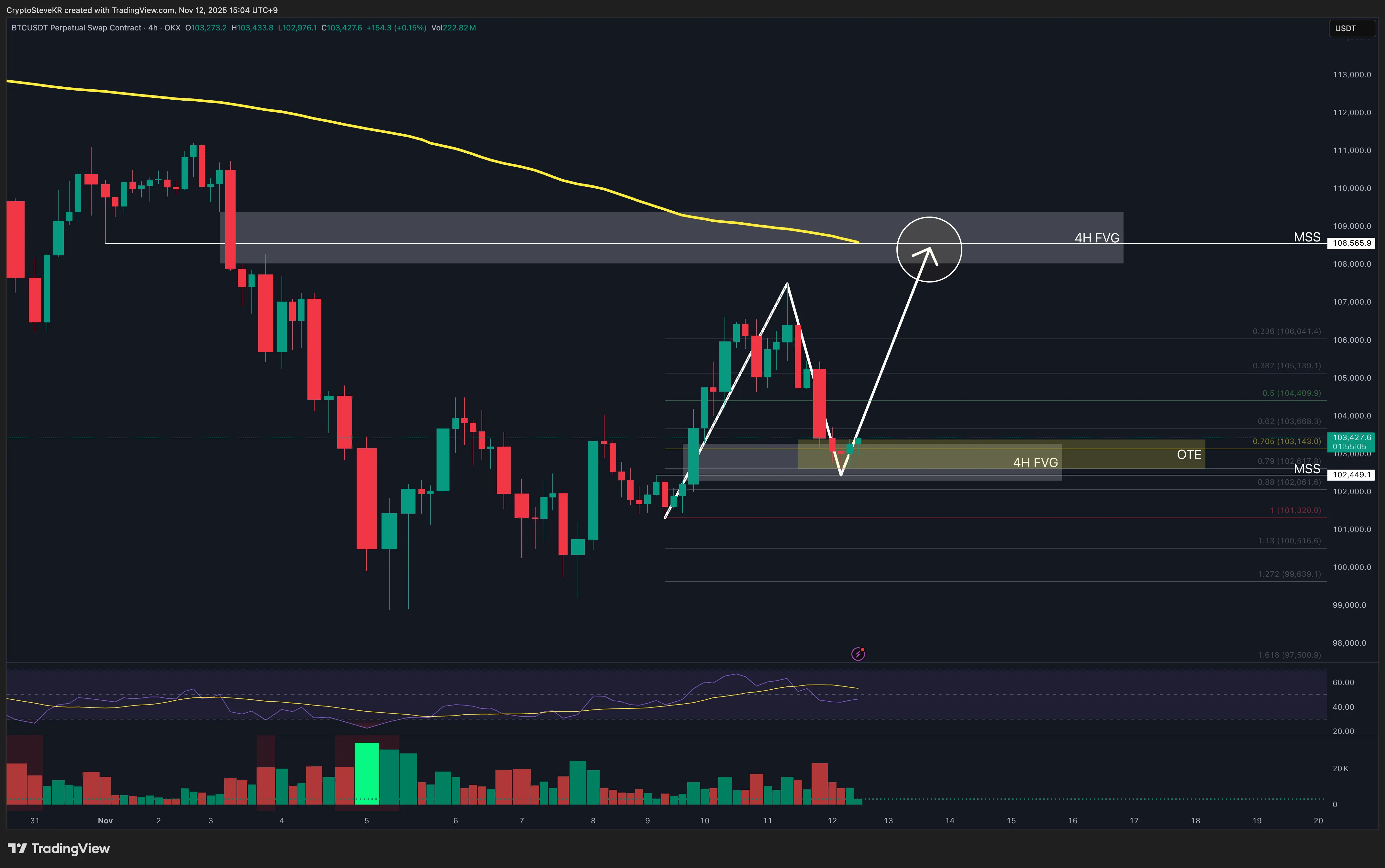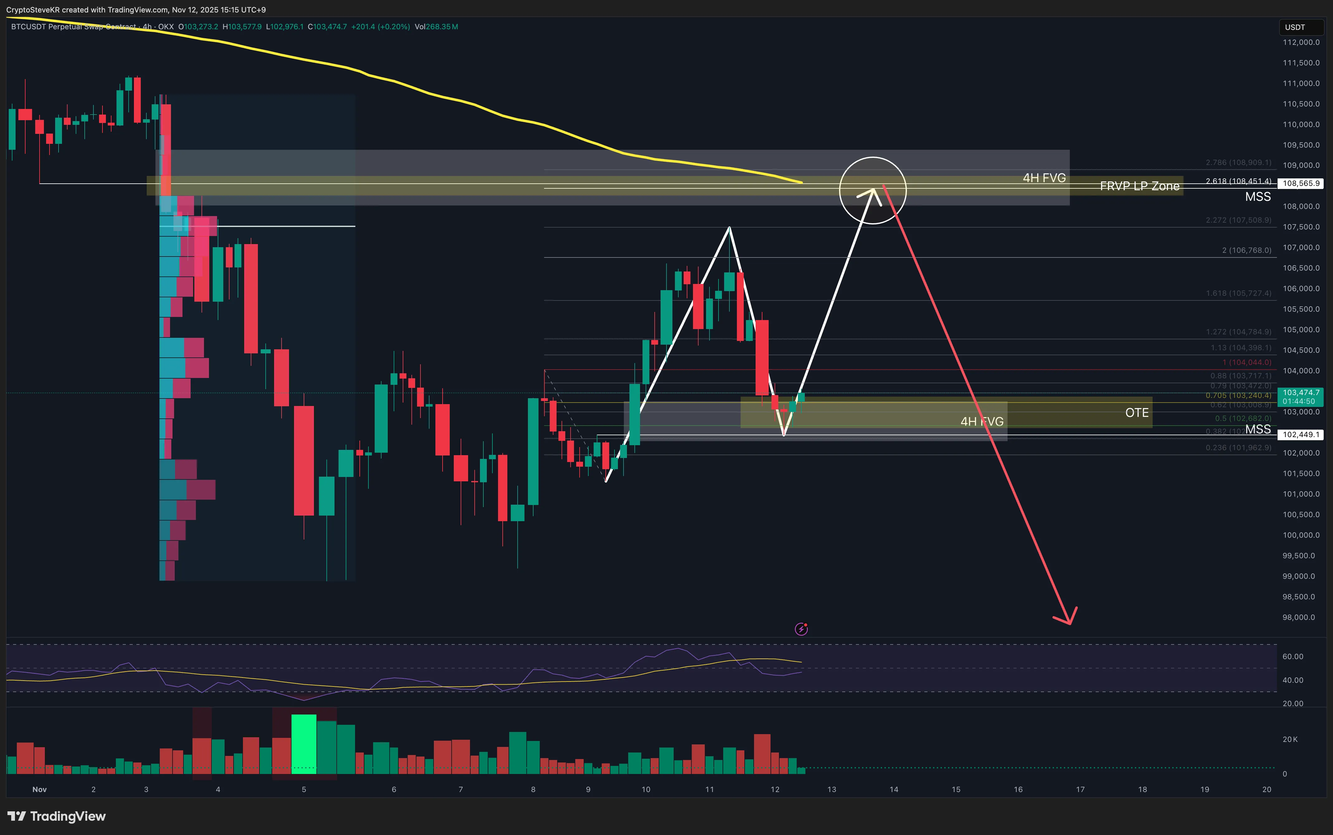 이에 단기 하락은 롱 스퀴징이었다고 판단하고, 반대로 어제부터 쌓인 고배 숏 포지션들을 터트리기 위한 상승이 시작되었다고 생각합니다. 아마도 목표 타겟은 어제 이야기 했던것과 마찬가지로 FVG + MSS 라인이 겹쳐있는 108.3k 근처 구간입니다.