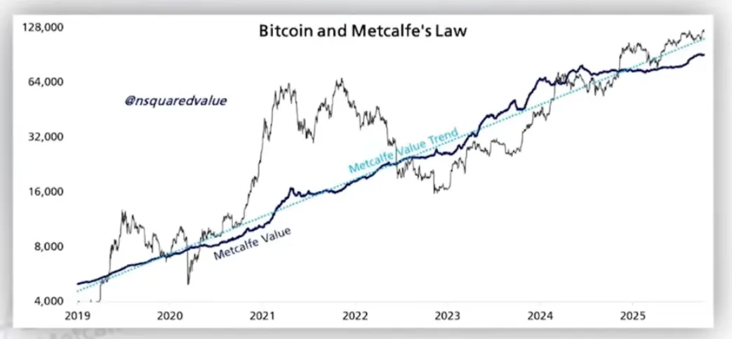 네트워크 참여자 수(예: 지갑 주소, 거래자 수)가 늘어날수록 이론적 가치도 상승하고, 실제 가격도 그 흐름을 따라가는 모습이에요.