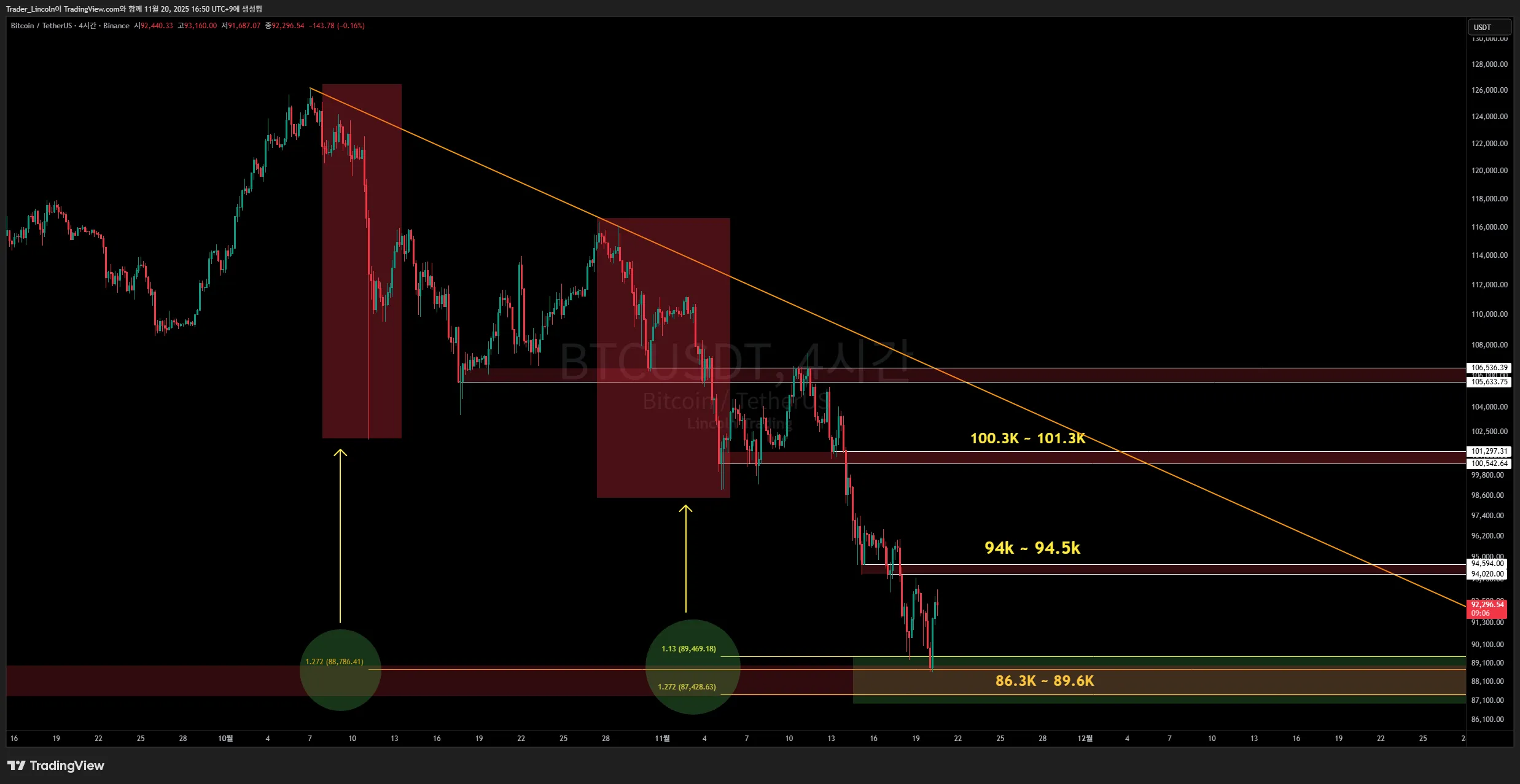 현재 '첫 번째 하락 파동의 1.272확장' 그리고 '두 번째 하락 파동의 1.13 ~ 1.272 확장'이 겹치는 구간, 즉 '주요 피보나치 레벨들이 겹치는 구간'인 '86k ~ 89k' 구간에서 소폭 반등이 진행 중입니다.
