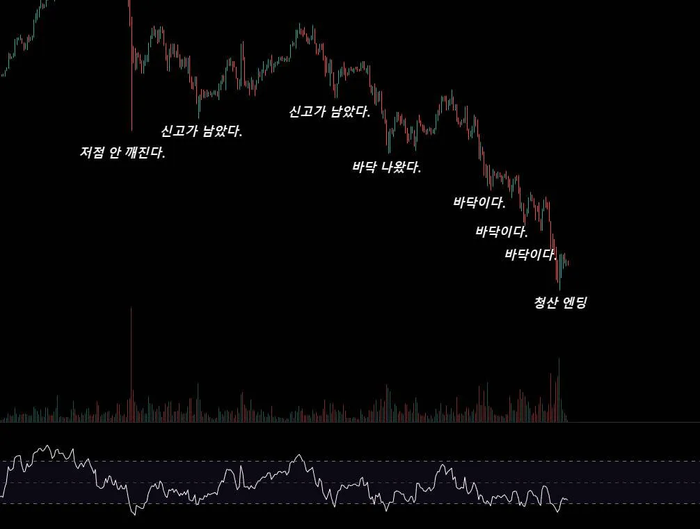 거래량이 실렸다는 건 그만큼 매도세가 따라왔다는 의미보다, 손실이라는 공포에 의해 투매 물량이 나왔다는 의미입니다.
