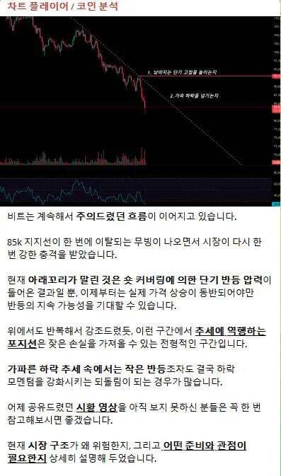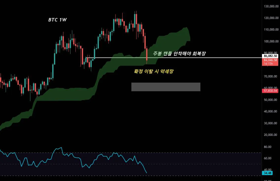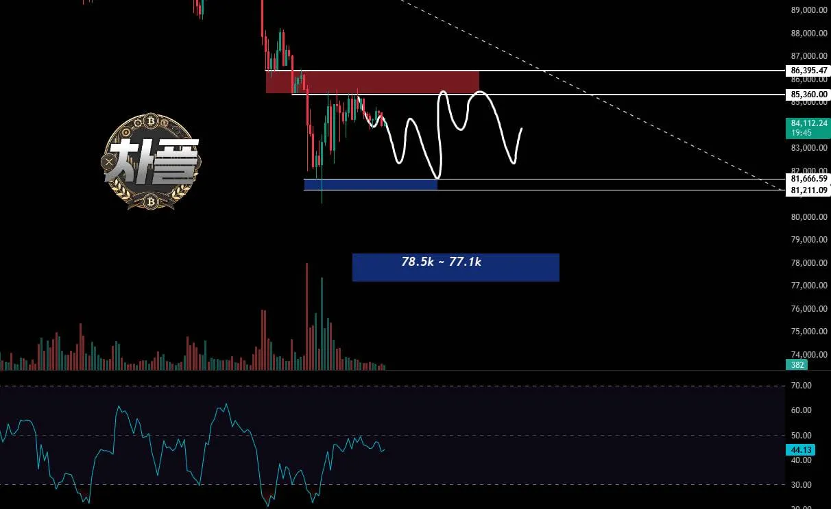 85.3k ~ 86.3k (저항이 매우 강하게 자리하고 있으며, 단기 반등이 오더라도 해당 구간을 돌파하긴 쉽지 않은 구조입니다.)