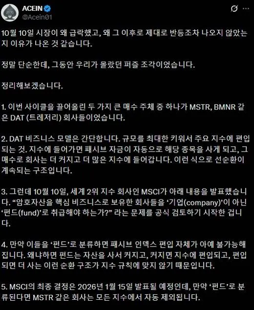 그러니까 10월 10일 급락은 우연이 아니라, 시장 구조 전체에 대한 큰 위험 신호를 스마트 머니가 먼저 본 것이었다는 얘기입니다.