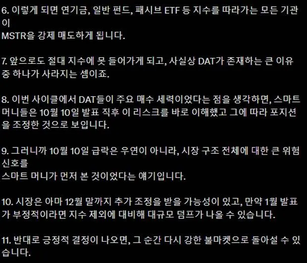 시장은 아마 12월 말까지 추가 조정을 받을 가능성이 있고, 만약 1월 발표가 부정적이라면, 지수 제외에 대비해 대규모 덤프가 나올 수 있습니다.