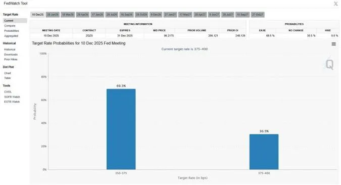 역시나 12월 10일 FOMC에서 금리를 인하할 것이라는 확률이 다시금 69%까지 올라왔습니다.