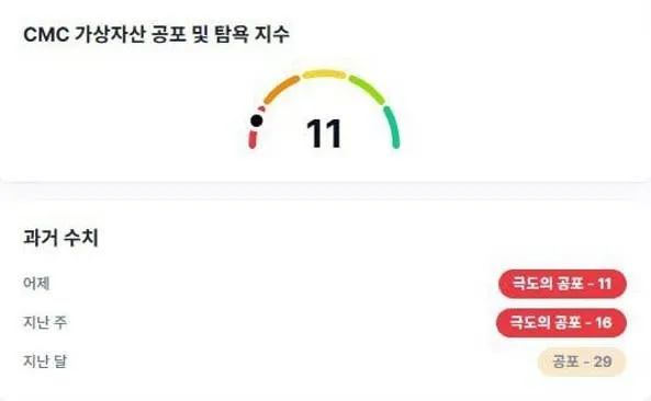 현재 코인 시장의 공포탐욕 지수는 11입니다.