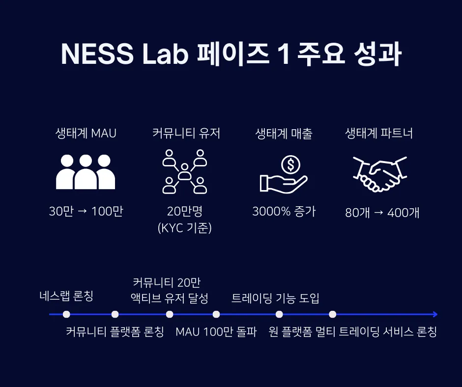 NESS LAB은 지난 2023년 NESS 토큰 론칭 이후 빠르게 성장하며 아시아 최대 웹3 미디어+커뮤니티 생태계 프로젝트로 자리매김했습니다. 동시에 3년전 청사진으로 제시한 로드맵을 이행하며 미디어, 커뮤니티, 트레이딩으로 이어지는 세계 최초의 웹3 트레이더 풀 라이프 사이클 생태계를 성공적으로 구축하였습니다. 이 기간 NESS LAB 생태계의 활성 이용자수는 100만명(MAU 기준)을 넘어섰습니다.