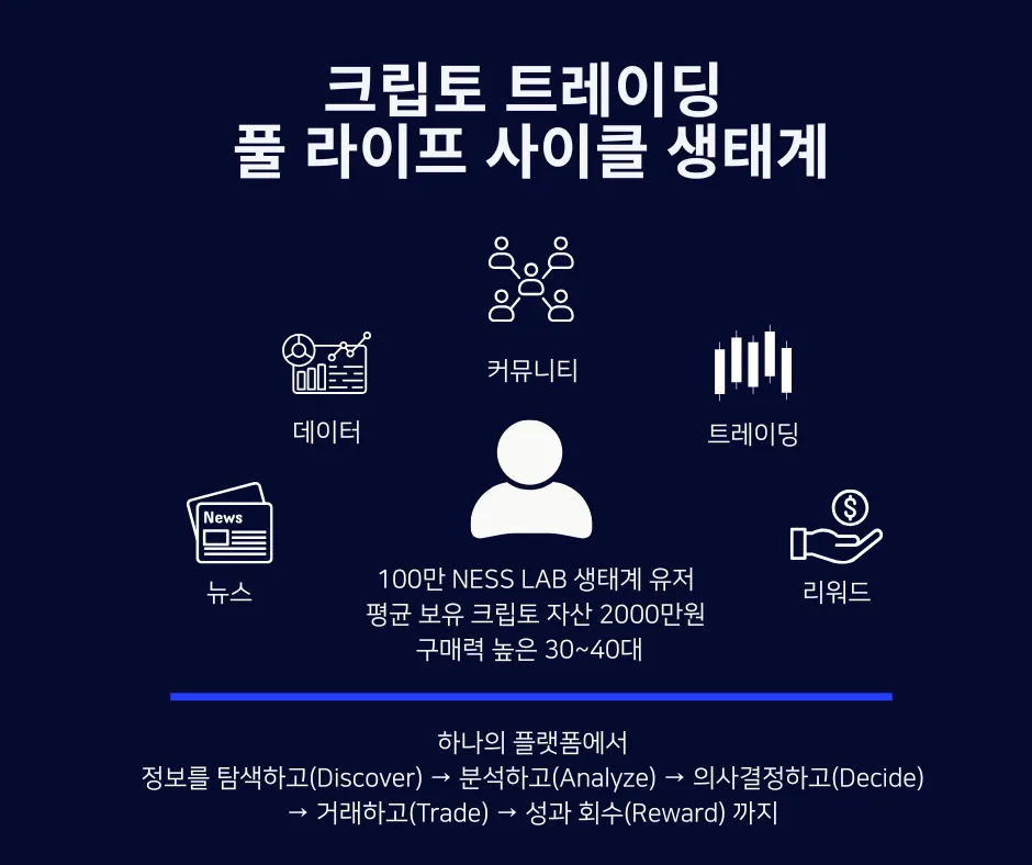 결과적으로 NESS LAB은 정보–커뮤니티–트레이딩–보상이 하나의 파이프라인으로 연결되는 생태계로 확장하며, 기존의 파편화된 크립토 환경이 제공하지 못했던 통합된 사용자 경험(Integrated User Journey)을 구현합니다.