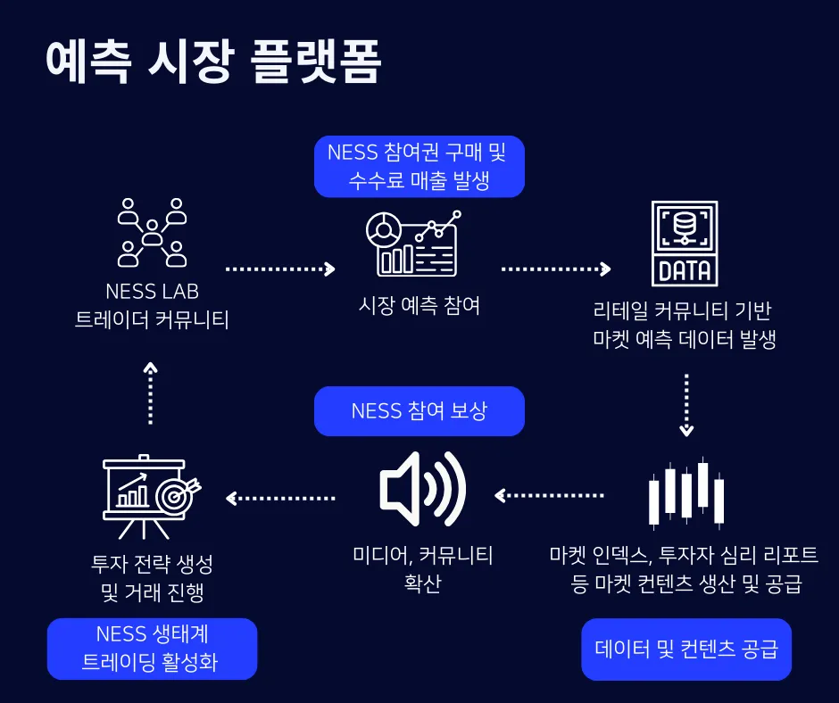 결과적으로 시장 예측 서비스는 단순한 부가기능이 아닌, “코인니스 커뮤니티 → 참여형 소셜 금융 서비스 → 예측 데이터 생산 → 공신력 있는 지표화 → 시장 영향력 강화”로 이어지는 강력한 플라이휠이 될 것입니다. 여기에 NESS 토큰의 유틸리티가 더해져 플랫폼 내 사용자 참여를 촉진하고 지속 가능한 수익모델로 작동하게 될 것입니다.