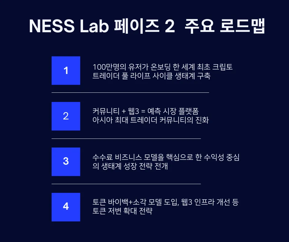 NESS LAB 페이즈 2는 1) 100만 유저가 온보딩한 세계 최초 크립토 트레이더 풀 라이프 사이클 생태계 구축 2) 커뮤니티+웹3 = 예측 시장 플랫폼 3) 수수료 비즈니스를 기반으로 한 수익성 중심의 생태계 성장 모델을 핵심 로드맵으로 NESS 생태계를 성장시켜 나갈 예정입니다. 특히 NESS 토큰의 저변 확대를 위해 글로벌 거래소들과의 적극적인 거래지원 협의, 온체인 인프라 개선, 바이백 및 소각 모델도입 등을 추진할 예정입니다.