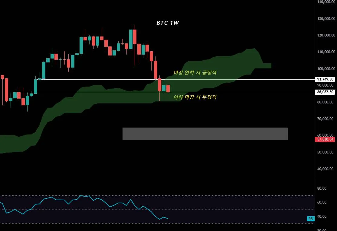 이번 주 주봉 종가가 86k 이하에서 마감될 경우, 주봉 차트의 가격 구조 역시 확정적으로 붕괴하게 됩니다.