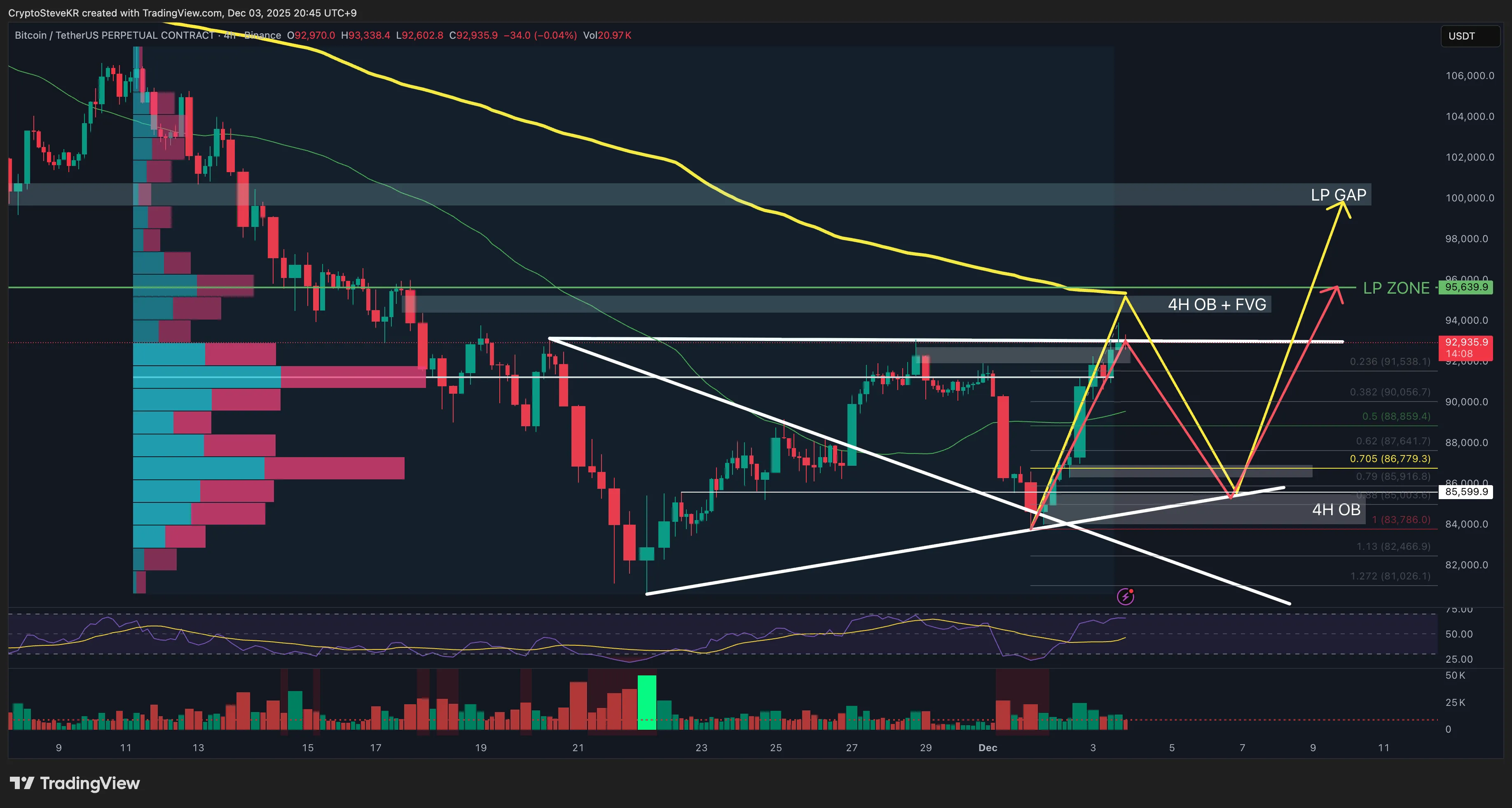 저는 하단의 추세선과 4시간봉 기준 OB, Fib 되돌림 OTE라인인 0.705 라인과 만나는 86.7K ~ 85.9K 사이 구간까지의 조정을 한번 더 줄 확률이 높다고 생각하고 있고, 여기를 지나 81K 까지 가격을 낮추며 현재의 채널을 강하게 위아래로 이탈하며 롱/숏 모두의 스탑로스를 모두 터트리는 Price action이 올 확률이 매우 높다고 생각하고 있습니다.