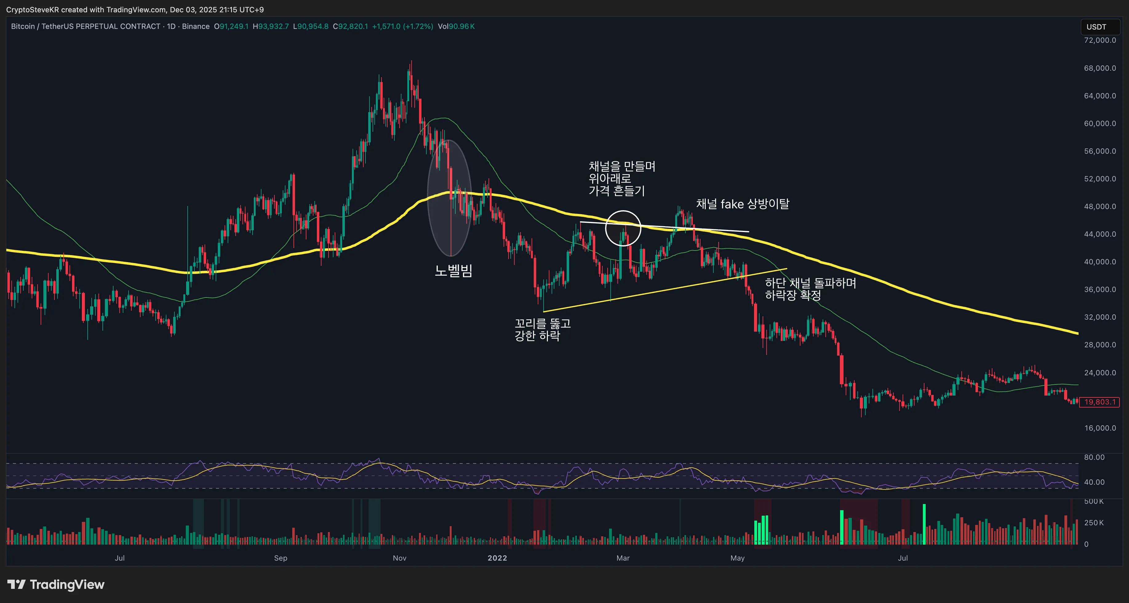 과거 21년 ATH를 찍고 하락하던 시점의 가격 움직임과 너무나 흡사한 것이 하나의 이유라고 하겠습니다.