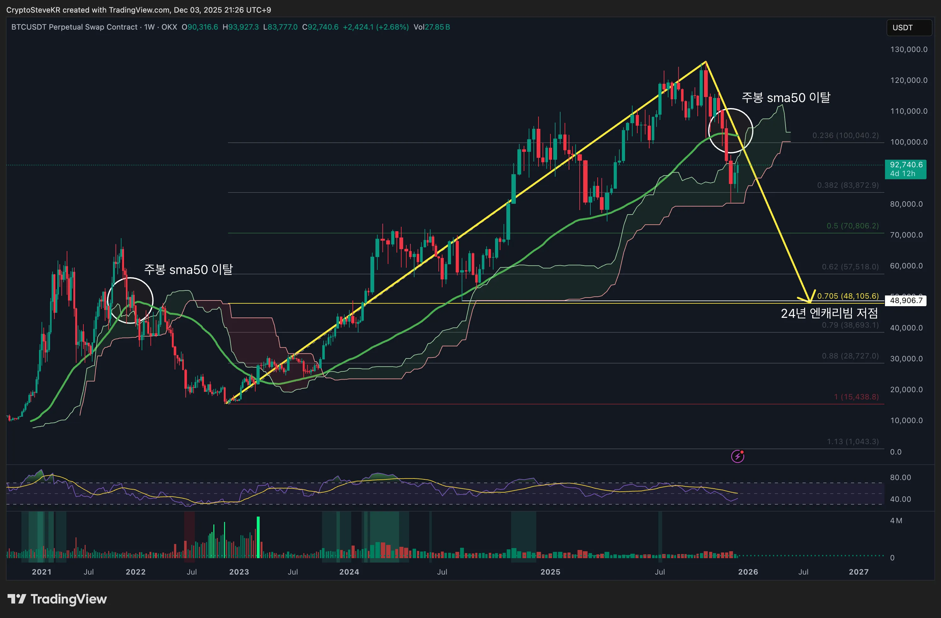 Fib OTE 라인과 24년 8월 5일 엔캐리 하락빔이 왔던 자리, 그리고 과거 22년 매물대의 핵심 저항 라인이 어느 정도 겹치는 구간이 바로 48.1k ~ 48.9k 구간입니다. 이런 라인까지 가격이 내려간다면 하락장의 끝이자 전체 상승 추세의 하단 추세선과 맞닿는 구간이 됩니다.