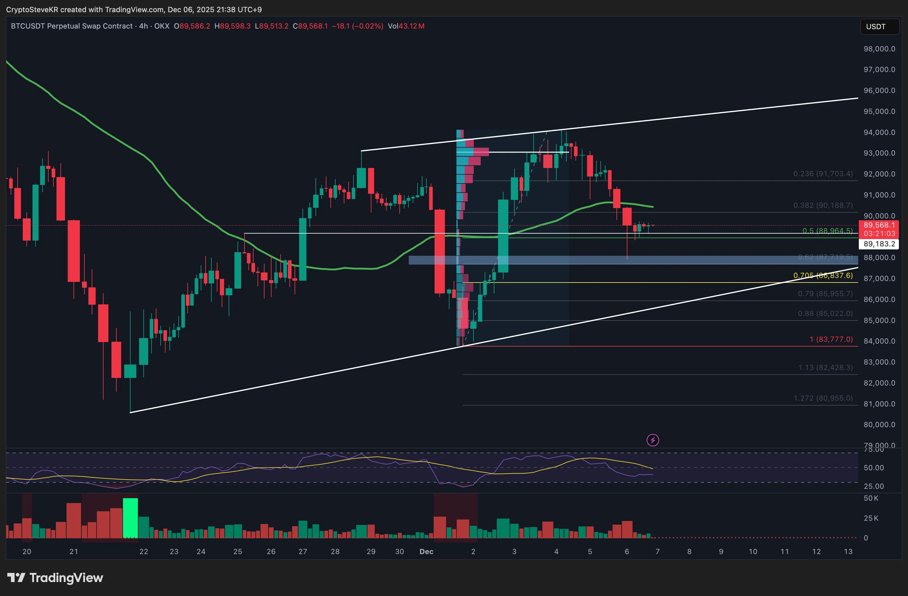 기존 관점의 목표가였던 86.9k 까지는 밀지 못하고, 0.62 되돌림 자리인 87.8k 까지의 강한 하락이 나왔습니다.