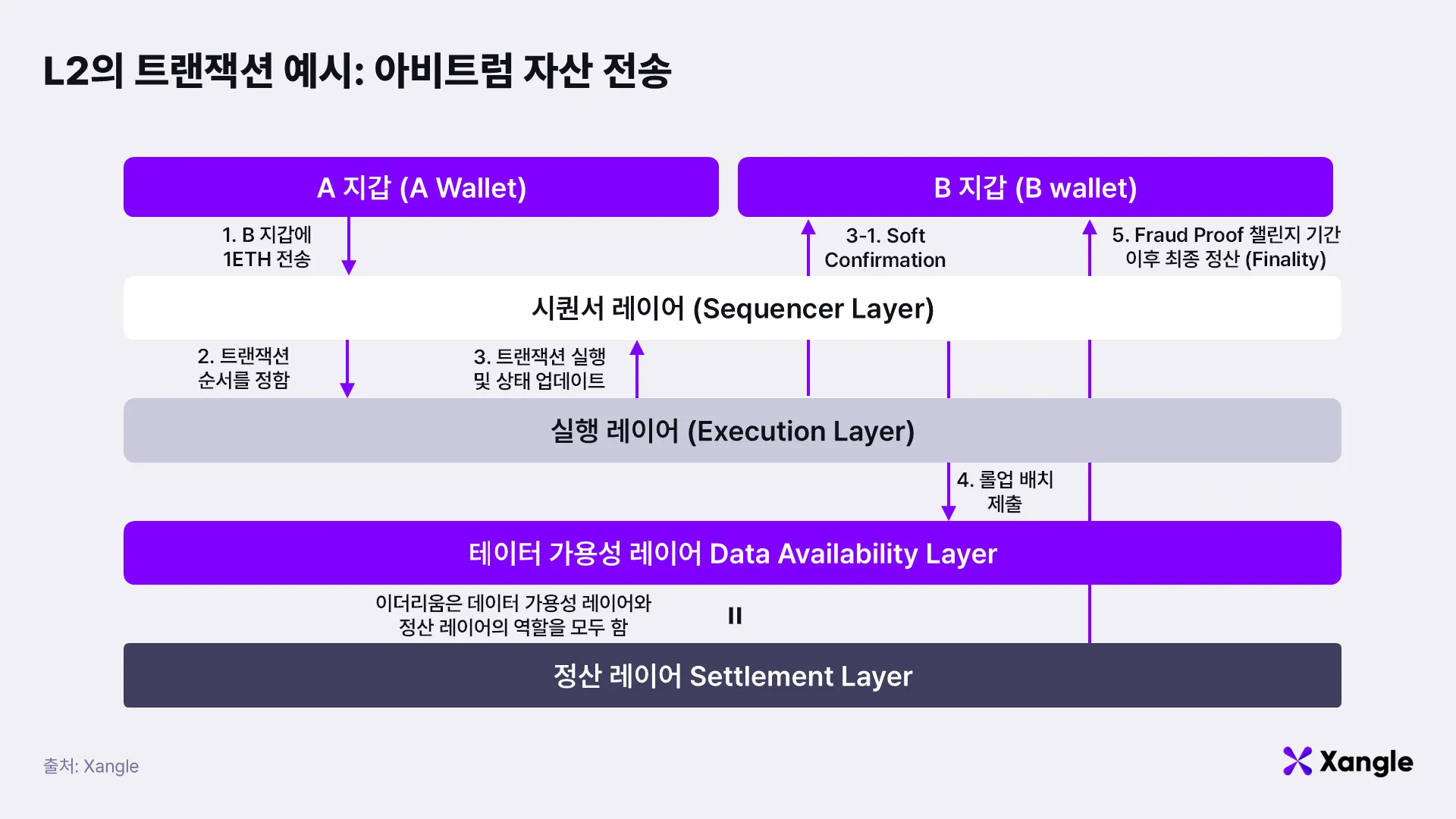 - 정산 레이어: Fraud Proof 챌린지 기간을 거쳐 이더리움 체인에서 최종 정산이 이루어짐