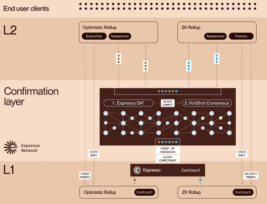 Espresso는 이러한 확정성 계층을 통해 속도와 신뢰성의 균형을 달성한다. L2는 기존의 단일 시퀀서 구조를 유지하면서도 Espresso 확정성 레이어를 통합할 수 있으며, 이때 블록 제안과 트랜잭션 순서 결정은 L2의 시퀀서가 담당하고, Espresso 네트워크가 HotShot 합의를 통해 해당 블록의 확정성을 보증한다.