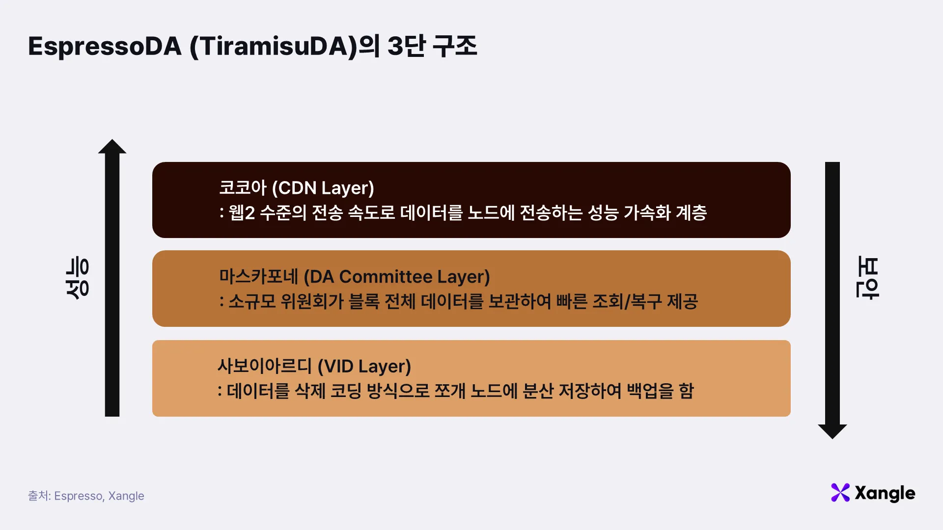 대부분의 L2들은 롤업된 트랜잭션 데이터를 L1인 이더리움에 올려, 누구나 모든 트랜잭션 정보를 보고 검증할 수 있도록 보장한다. 따라서 이더리움이 기본적인 데이터 가용성 레이어로 사용되어왔다. 하지만 이 방식은 비용이 높고 속도가 느리다는 한계가 있었고, Espresso는 이러한 문제를 해결하기 위해 자체 데이터 가용성 레이어인 EspressoDA를 제공한다. L2들은 트랜잭션 데이터를 이더리움에 직접 올리지 않고 EspressoDA에 저장함으로써, 보다 저렴하고 빠른 데이터 가용성을 확보할 수 있다. EspressoDA (TiramisuDA)는 빠르면서도 안전한 데이터 가용성 서비스를 제공하기 위해 마치 티라미수가 3단으로 코코아, 마스카포네, 사보이아르디 층으로 이루어진 것처럼 3단 구조로 설계되어 있다.