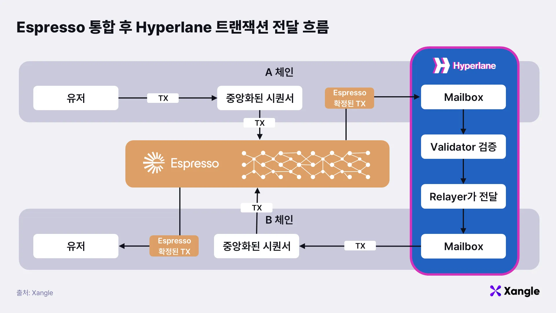 Espresso는 우선 체인 간 상호운용성을 강화하기 위해 Hyperlane과 LayerZero를 결합해 확정성 기반 크로스체인 통신을 제공하는 것을 지향한다. 기존 브릿징은 각 L2의 시퀀서가 제공하는 소프트 확정성과, 밸리데이터(Validator)·릴레이어(Relayer) 같은 오프체인 에이전트를 조합해 동작해 왔기 때문에, 시퀀서 재조직(Re-org)이나 장애 시 메시지 되돌림·중복 실행 위험이 존재했다.