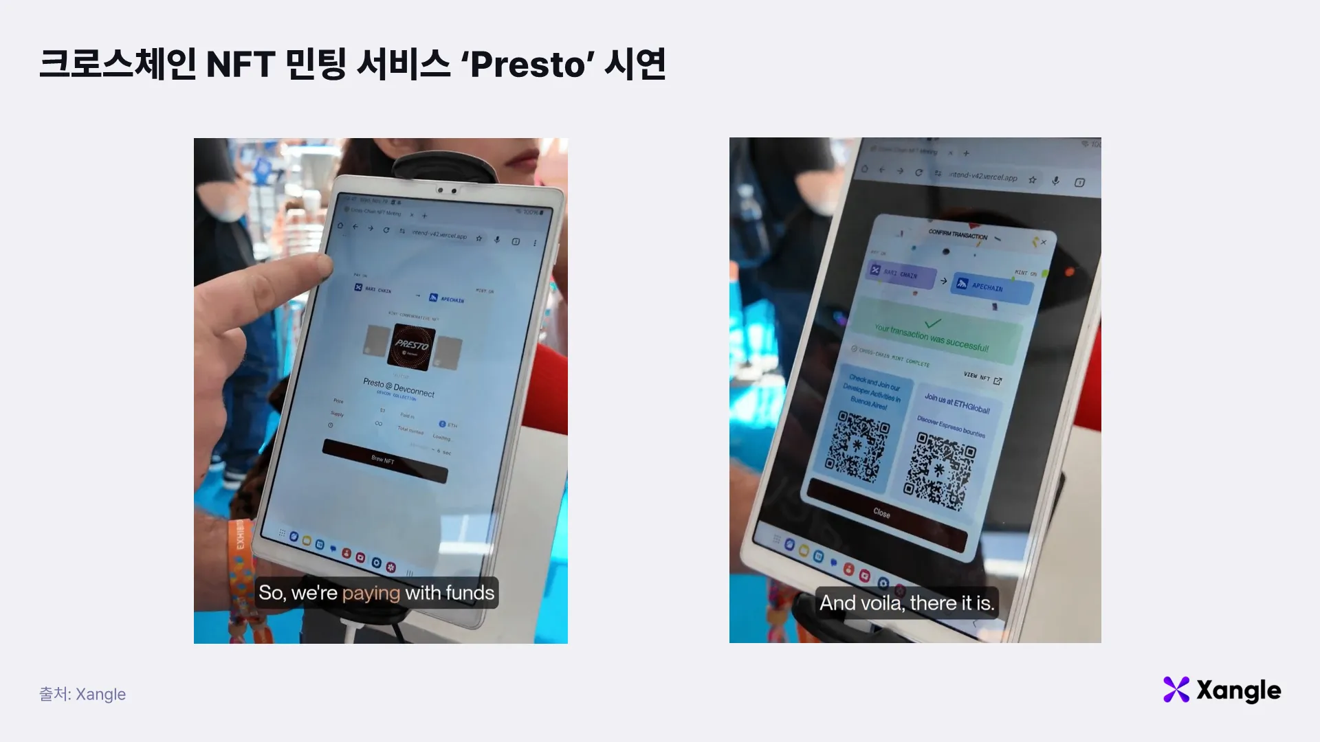 Devconnect 2025(11월)에서 시연된 ‘Presto’ 데모는 에스프레소가 단순 확정성 레이어를 넘어 상호운용성의 신뢰 기반으로 기능할 수 있음을 보여주는 대표 사례다. 데모에서는 RARI 체인과 AppChain 사이에서 에스프레소의 확정성을 활용한 크로스체인 NFT 민팅이 구현되었으며, 전체 흐름은 다음과 같이 진행되었다. 먼저 사용자가 RARI 체인에서 자금을 전송하면 해당 트랜잭션은 에스프레소를 통해 확정되고, 이후 ApeChain은 이 정보를 에스프레소에서 읽어 NFT를 발행한다. 발행된 NFT의 트랜잭션 역시 에스프레소에서 다시 한 번 확정되며, 이로써 사용자는 재조직이나 중복 실행 위험 없이 안전하게 NFT를 지갑에서 확인할 수 있었다. 이 전체 프로세스에서 체인 간 메시지 전달은 Hyperlane이 담당해, 에스프레소의 확정성과 Hyperlane의 메시징이 결합된 형태로 완성도 높은 크로스체인 동작이 시연되었다.