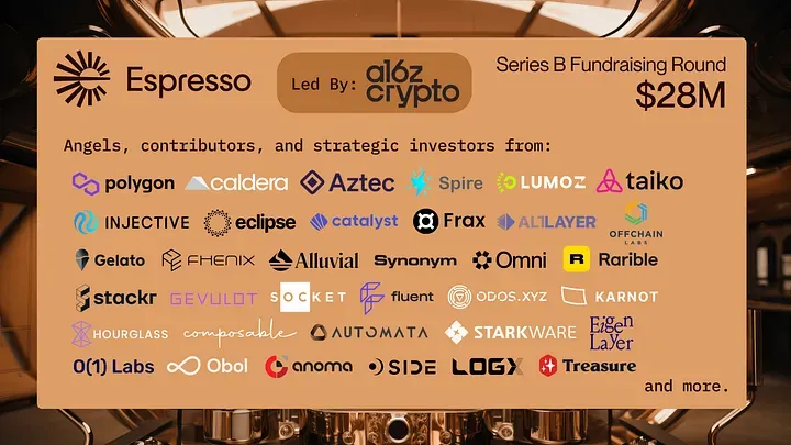 Espresso는 프라이빗 라운드와 커뮤니티 세일을 모두 포함해 총 $63.9 M(약 640억 원) 규모의 자금을 유치했다. 2020년 첫 시드 라운드에서 약 $2M을 확보하며 출발했고, 2022년에는 Greylock Partners와 Electric Capital이 공동으로 리드하고 Sequoia Capital, Blockchain Capital, Slow Ventures 등이 참여한 Series A 라운드에서 $29.9 M을 조달했다.